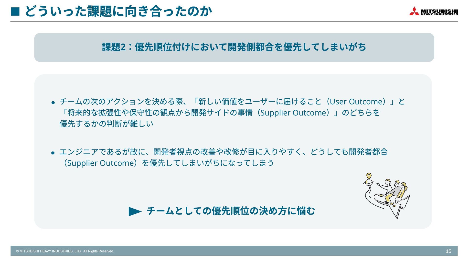 (User Outcome )」と​ 「将来的な​ 拡張性や​ 保守性の​ 観点から​ 開発サイドの​ 事情​ (Supplier Outcome )」の​ どちらを​ 優先するかの​ 判断が​ 難しい​ エンジニアであるが​ 故に、​ 開発者視点の​ 改善や​ 改修が​ 目に​ 入りやすく、​ どうしても​ 開発者都合​ (Supplier Outcome )を​ 優先してしまいが​ ちに​ なってしまう​ どういった課題に向き合ったのか チームと​ しての​ 優先順位の​ 決め方に​ 悩む 課題2 :優先順位付けに​ おいて​ 開発側都合を​ 優先してしまいが​ ち