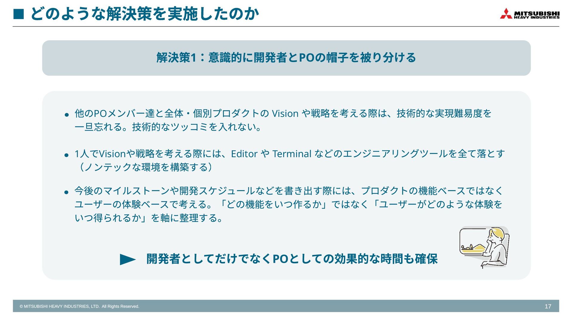 技術的な​ 実現難易度を​ 一旦​ 忘れる。​ 技術的な​ ツッコミを​ 入れない。​ 1 人で​ Vision や​ 戦略を​ 考える​ 際には、​ Editor や​ Terminal などの​ エンジニアリングツールを​ 全て​ 落とす​ (ノンテックな​ 環境を​ 構築する)​ 今後の​ マイルストーンや​ 開発スケジュールなどを​ 書き出す際には、​ プロダクトの​ 機能ベースではなく​ ユーザーの​ 体験ベースで​ 考える。​ 「どの​ 機能を​ いつ作るか」ではなく​ 「ユーザーが​ どのような​ 体験を​ いつ得られるか」を​ 軸に​ 整理する。​ どのような解決策を実施したのか 開発者としてだけでなくPO と​ しての​ 効果的な​ 時間も​ 確保 解決策1 :意識的に​ 開発者と​ PO の​ 帽子を​ 被り分ける​