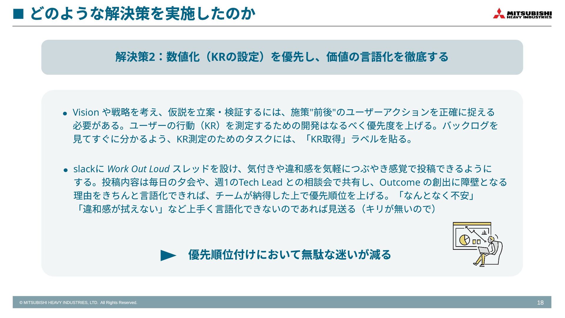 正確に​ 捉える​ 必要が​ ある。​ ユーザーの​ 行動​ (KR )を​ 測定する​ ための​ 開発は​ なるべく​ 優先度を​ 上げる。​ バック​ ログを​ 見て​ すぐに​ 分かる​ よう、​ KR 測定の​ ための​ タスクには、​ 「KR 取得」​ ラベルを​ 貼る。​ slack に​ Work Out Loud スレッドを​ 設け、​ 気付きや​ 違和感を​ 気軽に​ つぶやき感覚で​ 投稿できるように​ する。​ 投稿内容は​ 毎日の​ 夕会や、​ 週1 の​ Tech Lead との​ 相談会で​ 共有し、​ Outcome の​ 創出に​ 障壁と​ なる​ 理由を​ きちんと​ 言語化できれば、​ チームが​ 納得した上で​ 優先順位を​ 上げる。​ 「なんとなく​ 不安」​ 「違和感が​ 拭えない」など​ 上手く​ 言語化できないのであれば​ 見送る​ (キリが​ 無いので)​ 優先順位付けにおいて無駄な迷いが減る どのような解決策を実施したのか 解決策2 :数値化​ (KR の​ 設定)を​ 優先し、​ 価値の​ 言語化を​ 徹底する​