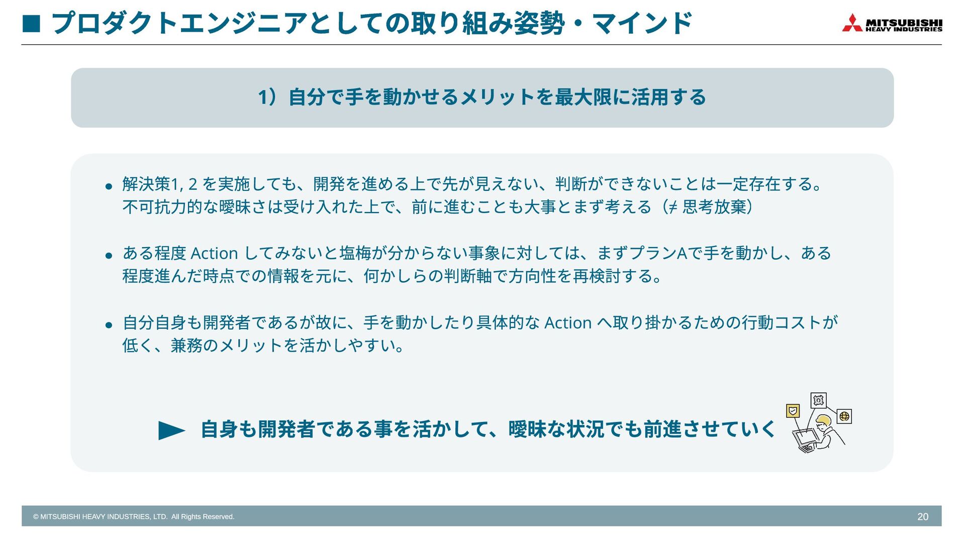 できない​ ことは​ 一定存在する。​ 不可抗力的な​ 曖昧さは​ 受け入れた​ 上で、​ 前に​ 進むことも​ 大事と​ まず​ 考える​ (≠ 思考放棄)​ ある​ 程度 Action してみないと​ 塩梅が​ 分からない​ 事象に​ 対しては、​ まずプランA で​ 手を​ 動かし、​ ある​ 程度​ 進んだ​ 時点での​ 情報を​ 元に、​ 何かしらの​ 判断軸で​ 方​ 向性を​ 再検討する。​ 自分​ 自身も​ 開発者であるが​ 故に、​ 手を​ 動か​ したり具体的な​ Action へ​ 取り掛かる​ ための​ 行動コストが​ 低く、​ 兼務の​ メリットを​ 活かしやすい。​ プロダクトエンジニアとしての取り組み姿勢・マインド 自身も開発者である事を活かして、​ 曖昧な​ 状況でも​ 前進させていく​ 1 )​ 自分で​ 手を​ 動かせる​ メリットを​ 最大限に​ 活用する​