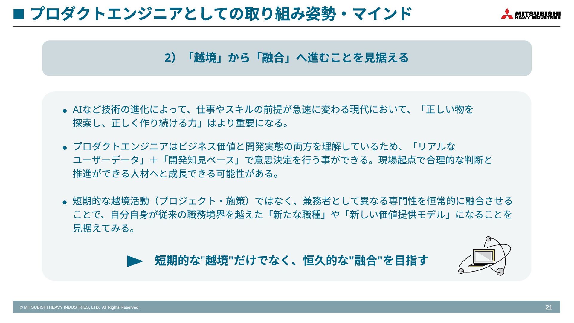 意思決定を​ 行う​ 事が​ できる。​ 現場起点で​ 合理的な​ 判断と​ 推進が​ できる​ 人材へと​ 成長できる​ 可能性が​ ある。​ AI など​ 技術の​ 進化に​ よって、​ 仕事や​ スキルの​ 前提が​ 急速に​ 変わる​ 現代に​ おいて、​ 「正しい​ 物を​ 探索し、​ 正しく​ 作り続ける​ 力」は​ より​ 重要に​ なる。​ 短期的な​ 越境活動​ (プロジェクト・施策)ではなく、​ 兼務者と​ して​ 異なる​ 専門性を​ 恒常的に​ 融合させる​ ことで、​ 自分​ 自身が​ 従来の​ 職務境界を​ 越えた​ 「新たな​ 職種」や​ 「新しい​ 価値提供モデル」に​ なる​ ことを​ 見据えてみる。​ プロダクトエンジニアとしての取り組み姿勢・マインド 短期的な​ " 越境" だけでなく、​ 恒久的な​ " 融合" を​ 目指す 2 )​ 「越境」から​ 「融合」​ へ​ 進むことを​ 見据える​