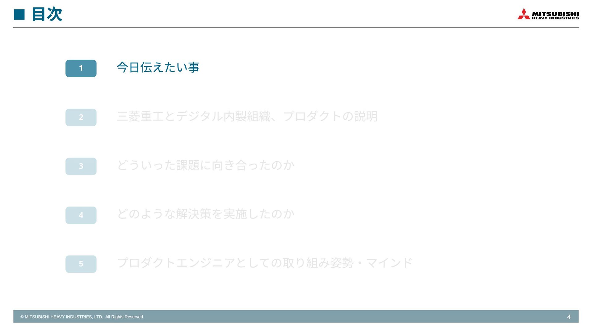 4. 1 2 3 4 今日​ 伝えたい​ 事 三菱重工と​ デジタル内製組織、​ プロダクトの​