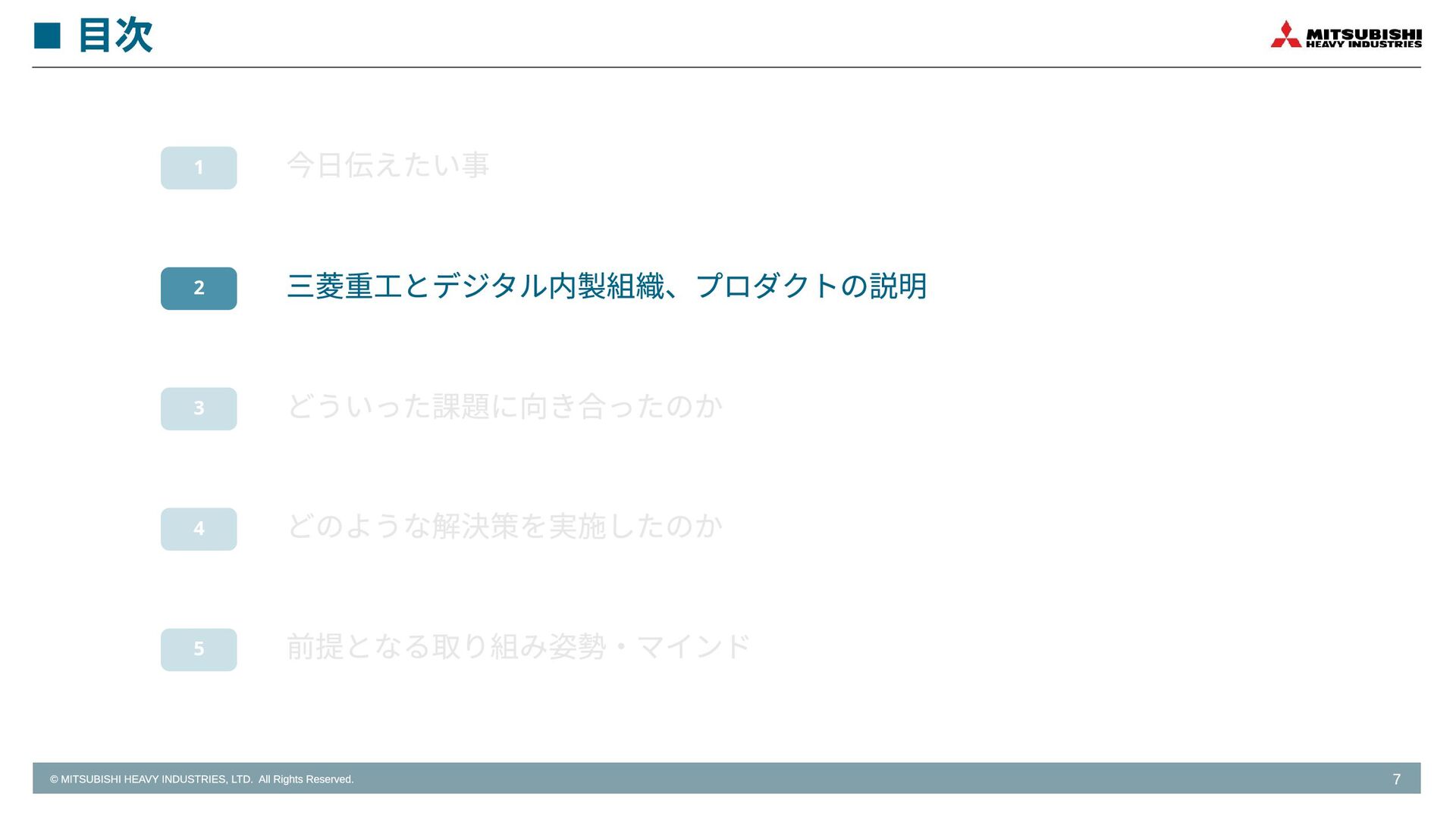 7. 1 2 3 4 今日​ 伝えたい​ 事 三菱重工と​ デジタル内製組織、​ プロダクトの​