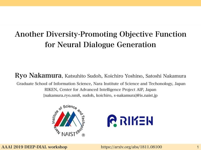 My oral presentation slide at AAAI 2019 Workshop on Reasoning and Learning for Human-Machine Dialogues (DEEP-DIAL 2019). paper: https://arxiv.org/abs/1811.08100 workshop site: https://sites.google.com/view/deep-dial-2019/program