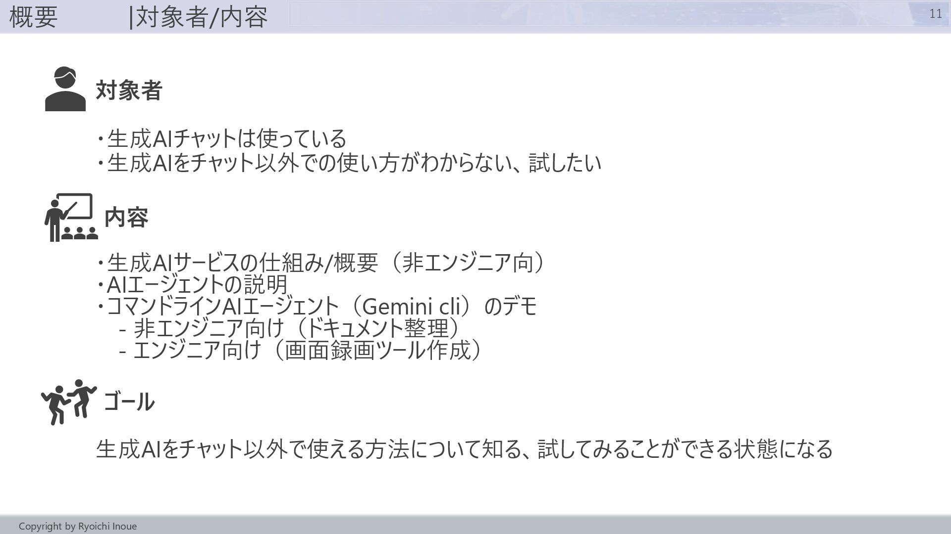 geminicliを例として、生成AIのチャット以外の使い方をデモを行いながら説明します。
