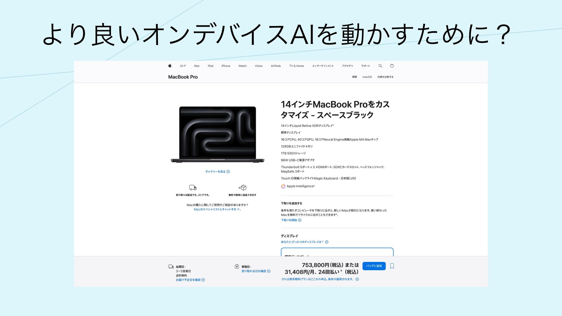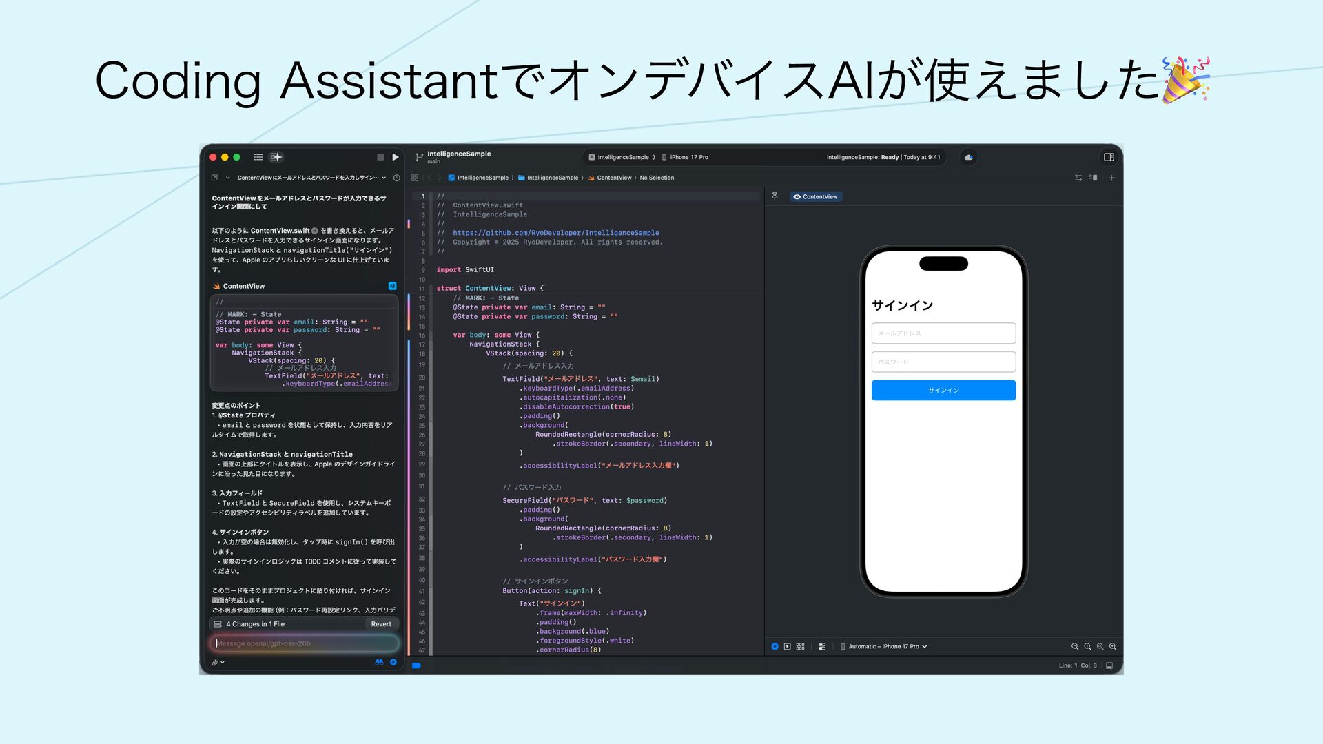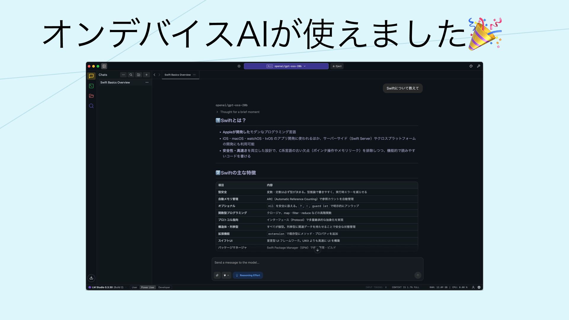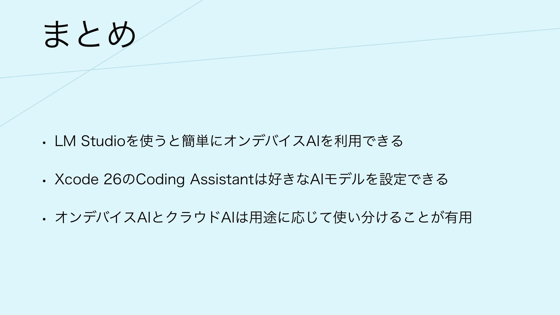 ·ͱΊ w -.4UVEJPΛ͏ͱ؆୯ʹΦϯσόΠε"*Λར༻Ͱ͖Δ w 9DPEFͷ$PEJOH"TTJTUBOU͖ͳ"*ϞσϧΛઃఆͰ͖Δ w ΦϯσόΠε"*ͱΫϥυ"*༻్ʹԠ͍͚ͯ͡Δ͜ͱ͕༗༻