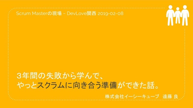 3年間の失敗から学んで、 やっとスクラムに向き合う準備ができた話。 Scrum Masterの現場 − DevLove関西 2019-02-08 株式会社イーシーキューブ 遠藤 良