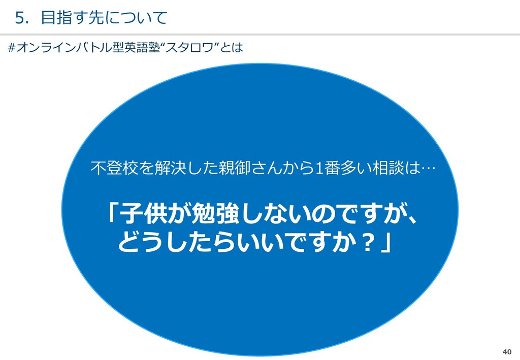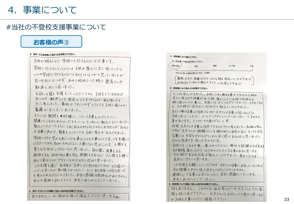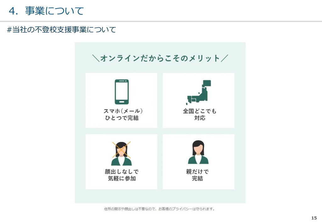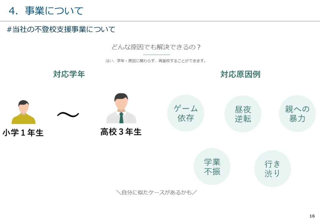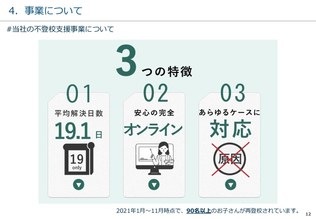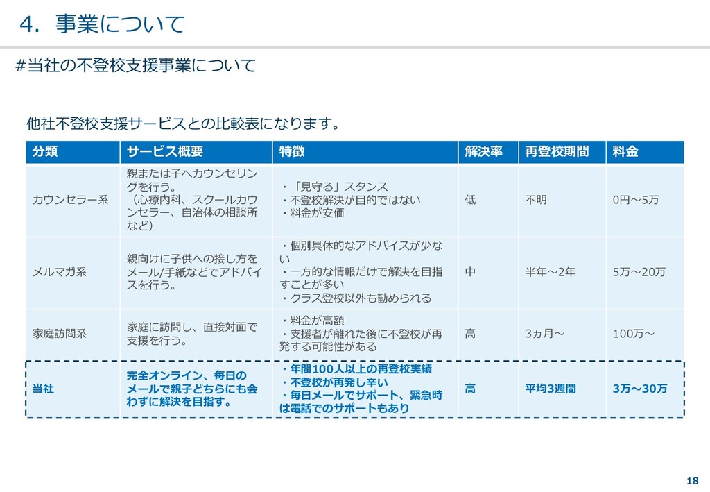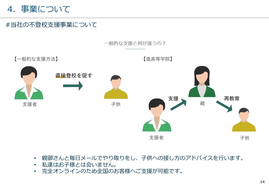 親または⼦へカウンセリン グを⾏う。 (⼼療内科、スクールカウ ンセラー、⾃治体の相談所 など) ・「⾒守る」スタンス ・不登校解決が⽬的ではない ・料⾦が安価 低 不明 0円〜5万 メルマガ系 親向けに⼦供への接し⽅を メール/⼿紙などでアドバイ スを⾏う。 ・個別具体的なアドバイスが少な い ・⼀⽅的な情報だけで解決を⽬指 すことが多い ・クラス登校以外も勧められる 中 半年〜2年 5万〜20万 家庭訪問系 家庭に訪問し、直接対⾯で ⽀援を⾏う。 ・料⾦が⾼額 ・⽀援者が離れた後に不登校が再 発する可能性がある ⾼ 3ヵ⽉〜 100万〜 当社 完全オンライン、毎⽇の メールで親⼦どちらにも会 わずに解決を⽬指す。 ・年間100⼈以上の再登校実績 ・不登校が再発し⾟い ・毎⽇メールでサポート、緊急時 は電話でのサポートもあり ⾼ 平均3週間 3万〜30万 #当社の不登校⽀援事業について
