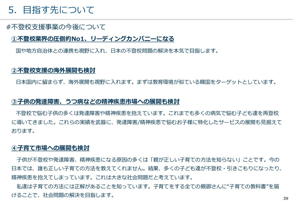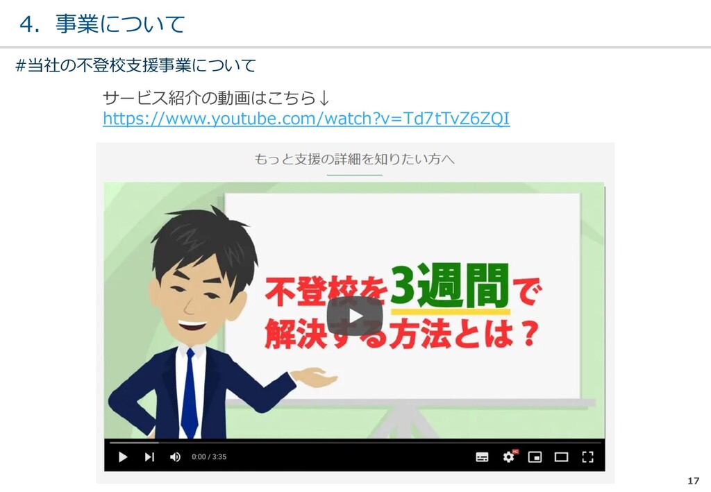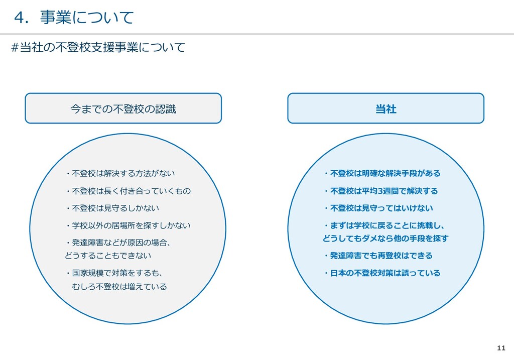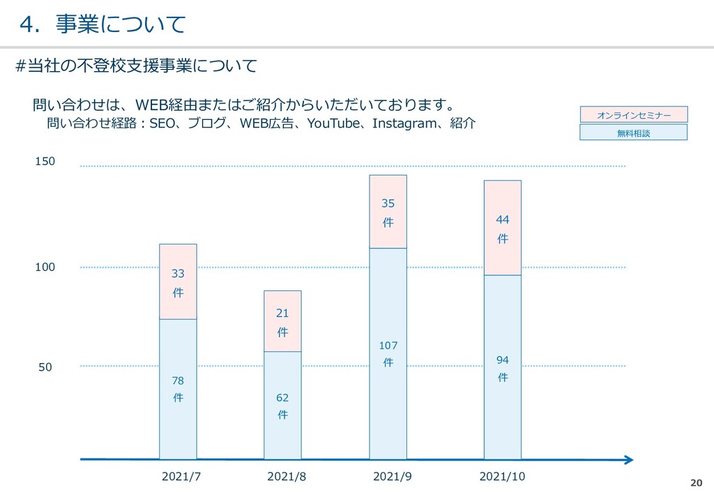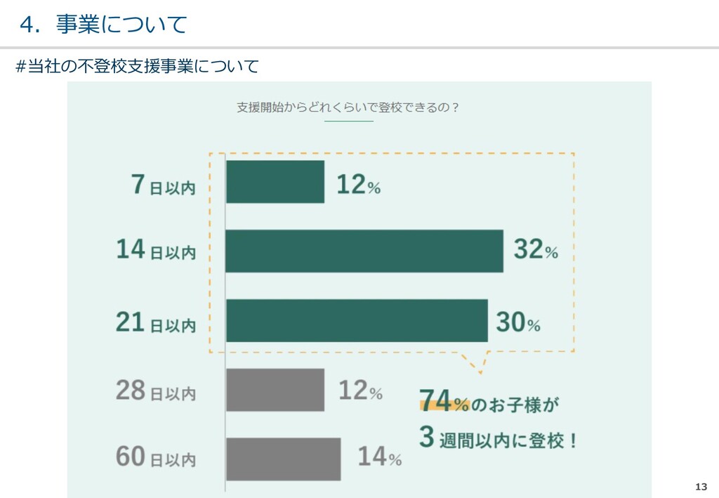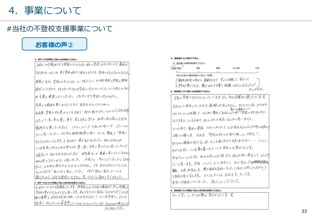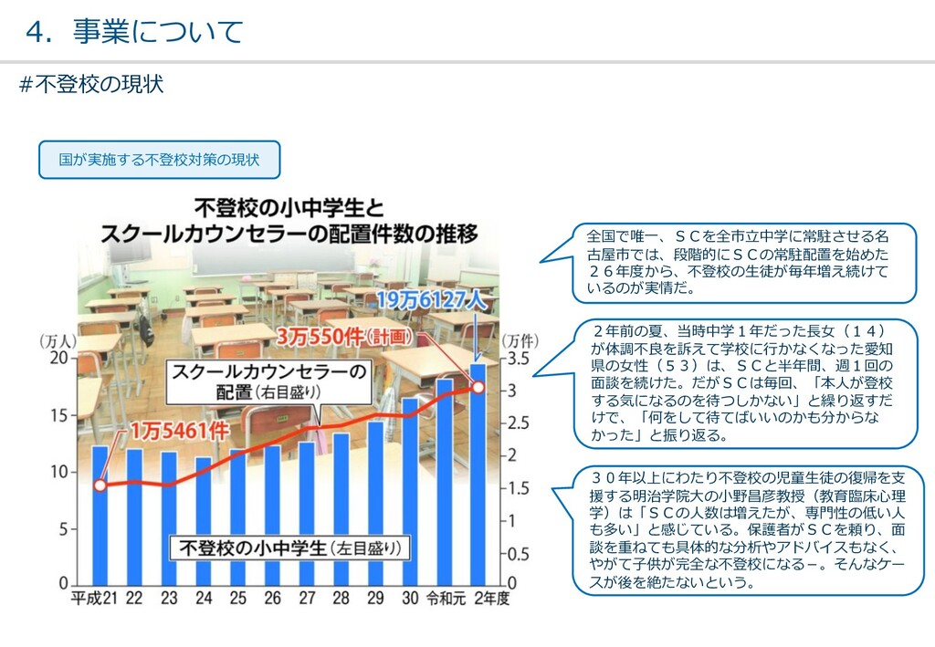 親または⼦へカウンセリン グを⾏う。 (⼼療内科、スクールカウ ンセラー、⾃治体の相談所 など) ・「⾒守る」スタンス ・不登校解決が⽬的ではない ・料⾦が安価 低 不明 0円〜5万 メルマガ系 親向けに⼦供への接し⽅を メール/⼿紙などでアドバイ スを⾏う。 ・個別具体的なアドバイスが少な い ・⼀⽅的な情報だけで解決を⽬指 すことが多い ・クラス登校以外も勧められる 中 半年〜2年 5万〜20万 家庭訪問系 家庭に訪問し、直接対⾯で ⽀援を⾏う。 ・料⾦が⾼額 ・⽀援者が離れた後に不登校が再 発する可能性がある ⾼ 3ヵ⽉〜 100万〜 当社 完全オンライン、毎⽇の メールで親⼦どちらにも会 わずに解決を⽬指す。 ・年間100⼈以上の再登校実績 ・不登校が再発し⾟い ・毎⽇メールでサポート、緊急時 は電話でのサポートもあり ⾼ 平均3週間 3万〜30万 #当社の不登校⽀援事業について
