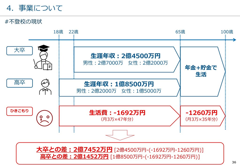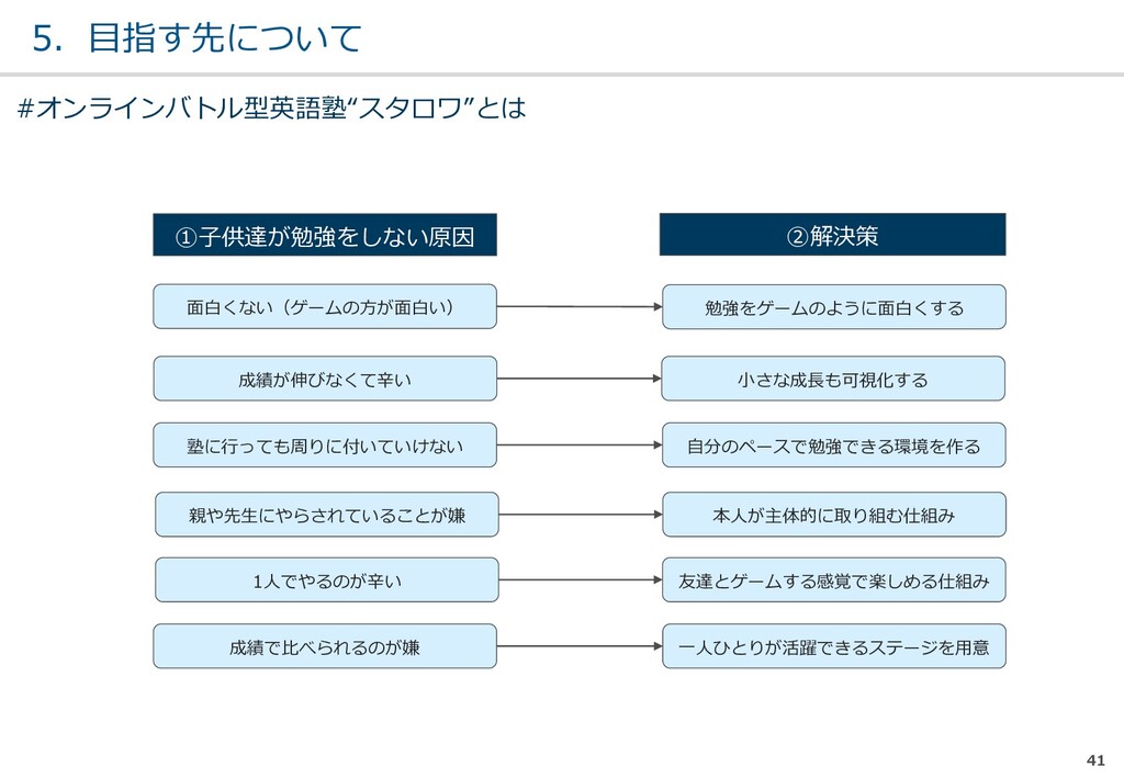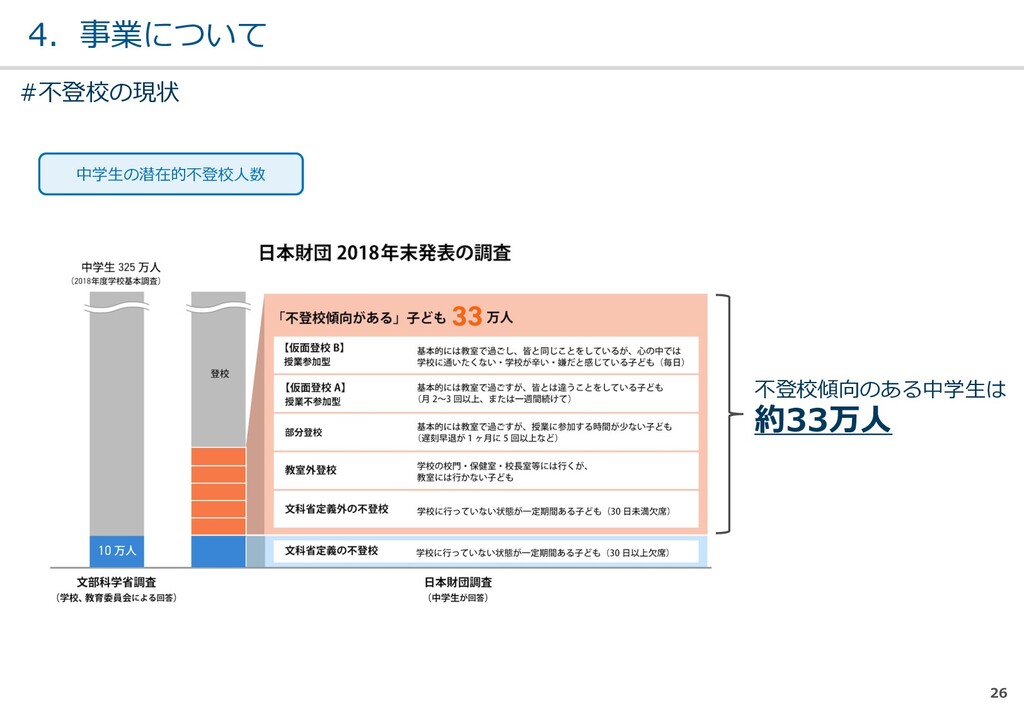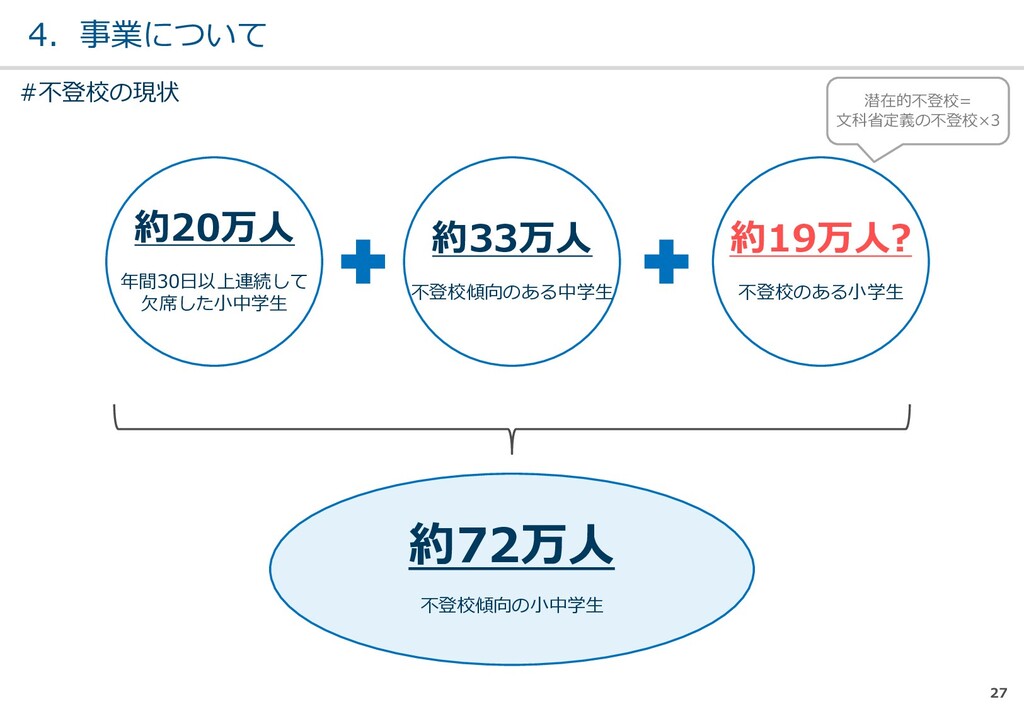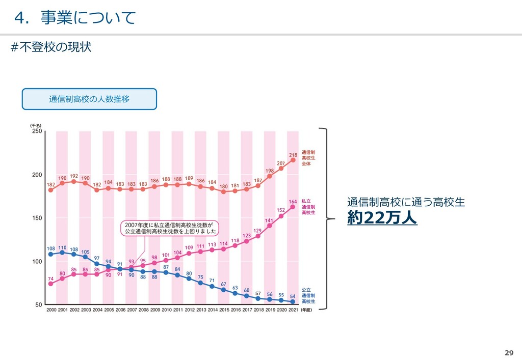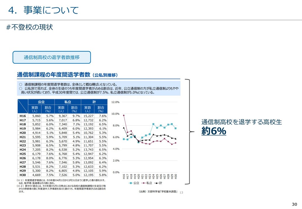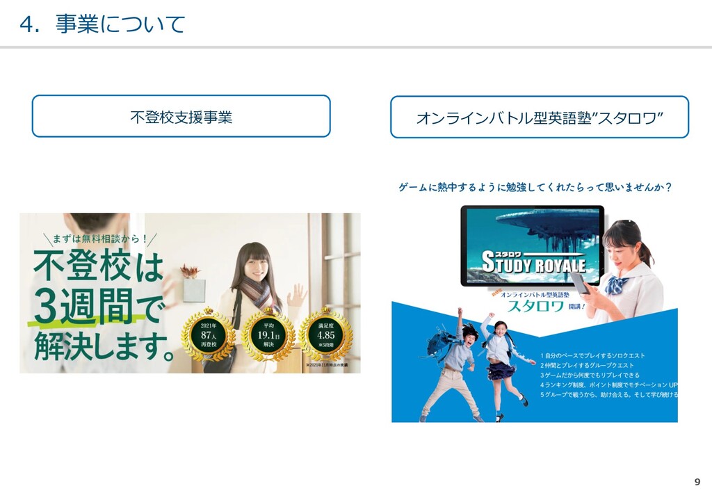親または⼦へカウンセリン グを⾏う。 (⼼療内科、スクールカウ ンセラー、⾃治体の相談所 など) ・「⾒守る」スタンス ・不登校解決が⽬的ではない ・料⾦が安価 低 不明 0円〜5万 メルマガ系 親向けに⼦供への接し⽅を メール/⼿紙などでアドバイ スを⾏う。 ・個別具体的なアドバイスが少な い ・⼀⽅的な情報だけで解決を⽬指 すことが多い ・クラス登校以外も勧められる 中 半年〜2年 5万〜20万 家庭訪問系 家庭に訪問し、直接対⾯で ⽀援を⾏う。 ・料⾦が⾼額 ・⽀援者が離れた後に不登校が再 発する可能性がある ⾼ 3ヵ⽉〜 100万〜 当社 完全オンライン、毎⽇の メールで親⼦どちらにも会 わずに解決を⽬指す。 ・年間100⼈以上の再登校実績 ・不登校が再発し⾟い ・毎⽇メールでサポート、緊急時 は電話でのサポートもあり ⾼ 平均3週間 3万〜30万 #当社の不登校⽀援事業について