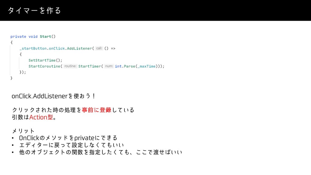 λΠϚʔΛ࡞Δ PO$MJDL"EE-JTUFOFSΛ͓͏ʂ ΫϦοΫ͞Εͨ࣌ͷॲཧΛࣄલʹొ͍ͯ͠Δ Ҿ"DUJPOܕɻ ϝϦοτ • 0O$MJDLͷϝιουΛQSJWBUFʹͰ͖Δ • ΤσΟλʔʹͬͯઃఆ͠ͳ͍͍ͯ͘ •