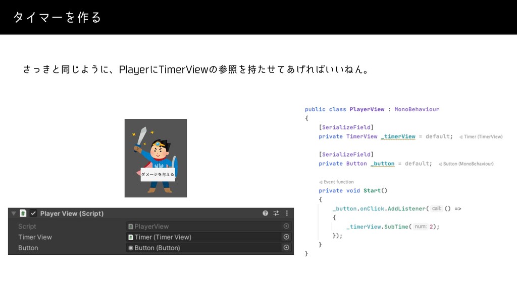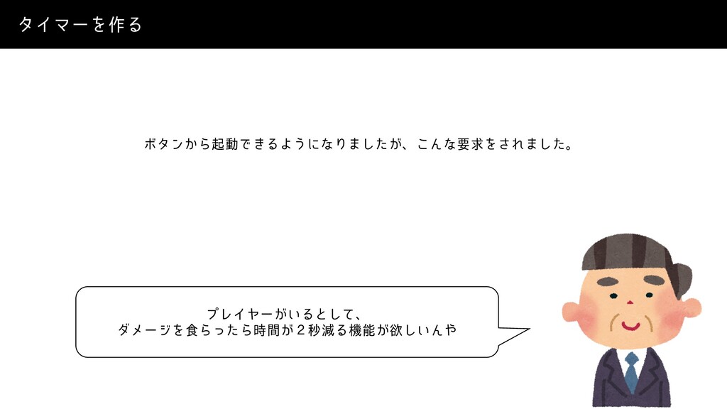 λΠϚʔΛ࡞Δ ϓϨΠϠʔ͕͍Δͱͯ͠ɺ μϝʔδΛ৯ΒͬͨΒ͕࣌ؒ̎ඵݮΔػೳ͕ཉ͍͠Μ Ϙλϯ͔ΒىಈͰ͖ΔΑ͏ʹͳΓ·͕ͨ͠ɺ͜ΜͳཁٻΛ͞Ε·ͨ͠ɻ
