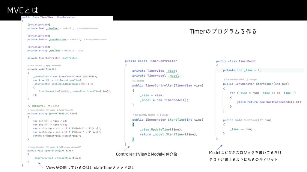 .7$ͱ 5JNFSͷϓϩάϥϜΛ࡞Δ 7JFX͕ެ։͍ͯ͠Δͷ6QEBUF5JNFϝιου͚ͩ $POUSPMMFS7JFXͱ.PEFMͷհ .PEFMϏδωεϩδοΫΛॻ͍ͯΔ͚ͩ ςετ͕ॻ͚ΔΑ͏ʹͳΔͷ͕ϝϦοτ