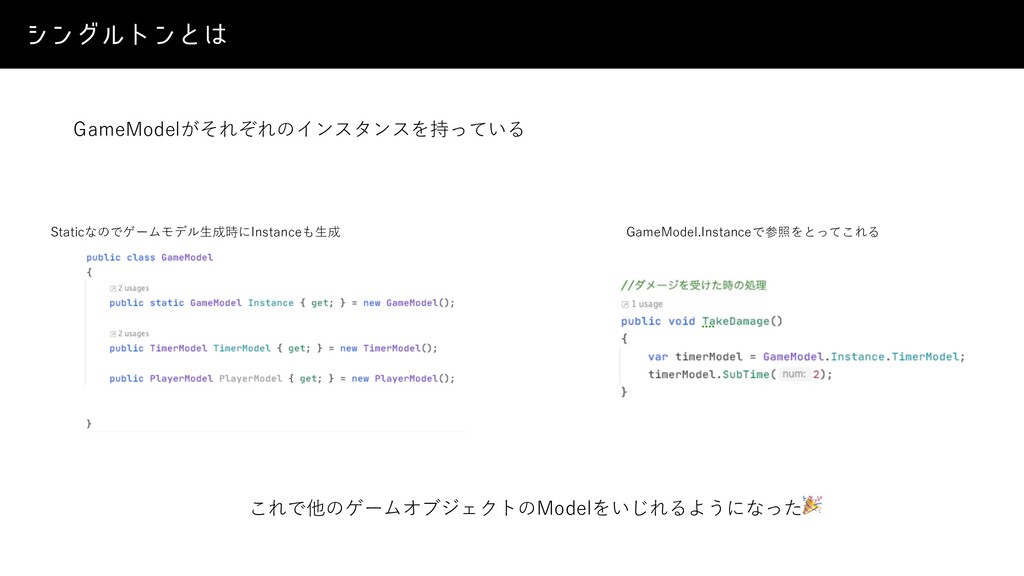 γϯάϧτϯͱ GameModelがそれぞれのインスタンスを持っている Staticなのでゲームモデル⽣成時にInstanceも⽣成 GameModel.Instanceで参照をとってこれる これで他のゲームオブジェクトのModelをいじれるようになった