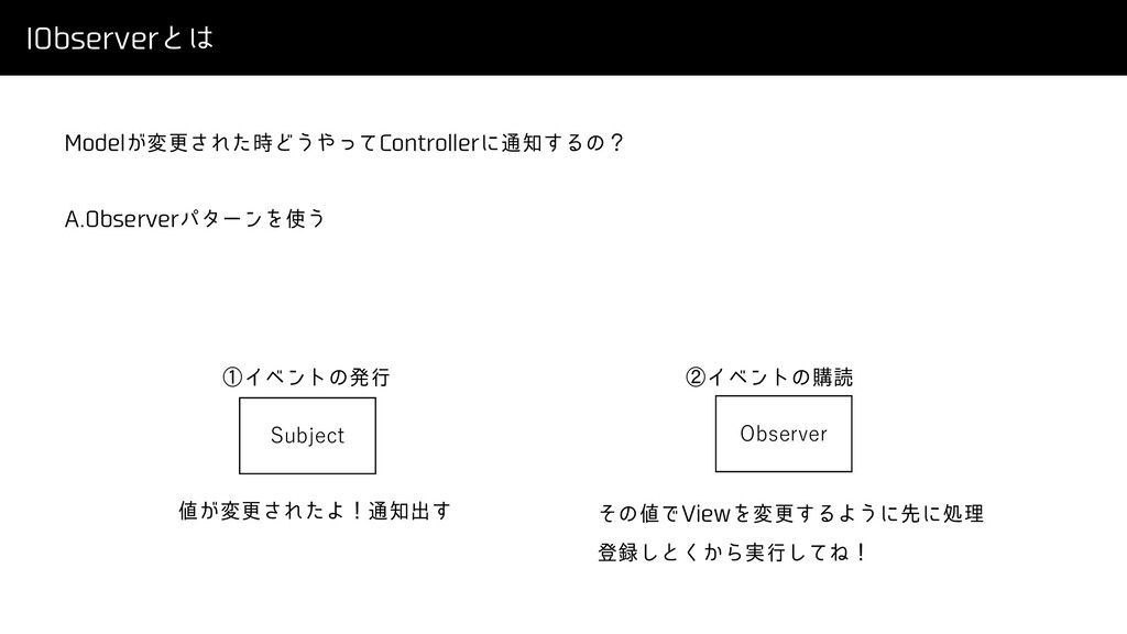 *0CTFSWFSͱ .PEFM͕มߋ͞Εͨ࣌Ͳ͏ͬͯ$POUSPMMFSʹ௨͢Δͷʁ "0CTFSWFSύλʔϯΛ͏ Subject Observer ᶃΠϕϯτͷൃߦ ᶄΠϕϯτͷߪಡ ͕มߋ͞ΕͨΑʂ௨ग़͢ ͦͷͰ7JFXΛมߋ͢ΔΑ͏ʹઌʹॲཧ ొ͠ͱ͔͘Β࣮ߦͯ͠Ͷʂ