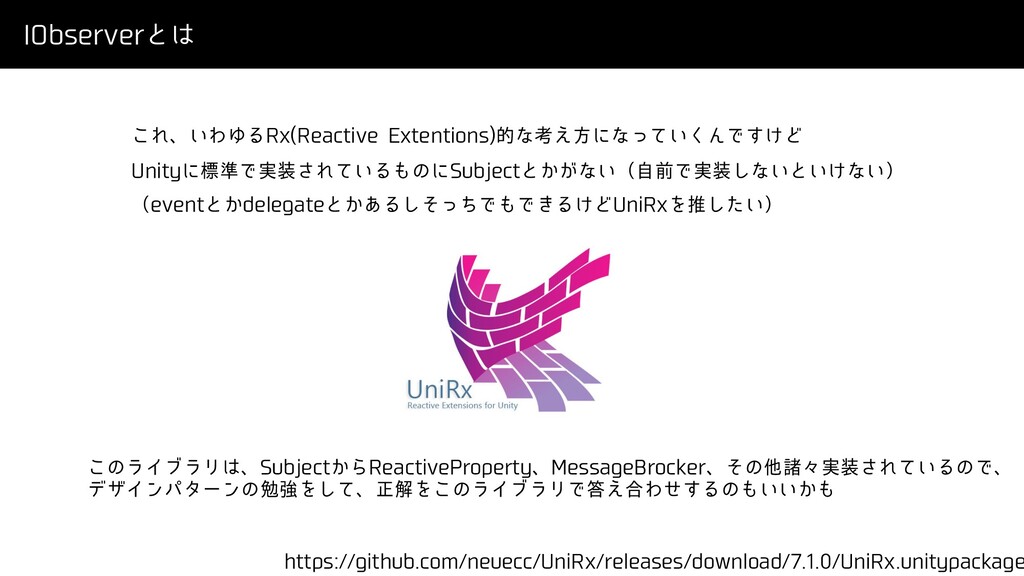 *0CTFSWFSͱ ͜Εɺ͍ΘΏΔ3Y 3FBDUJWF&YUFOUJPOT తͳߟ͑ํʹͳ͍ͬͯ͘ΜͰ͚͢Ͳ 6OJUZʹඪ४Ͱ࣮͞Ε͍ͯΔͷʹ4VCKFDUͱ͔͕ͳ͍ʢࣗલͰ࣮͠ͳ͍ͱ͍͚ͳ͍ʣ ʢFWFOUͱ͔EFMFHBUFͱ͔͋Δͦͬͪ͠ͰͰ͖Δ͚Ͳ6OJ3YΛਪ͍ͨ͠ʣ IUUQTHJUIVCDPNOFVFDD6OJ3YSFMFBTFTEPXOMPBE6OJ3YVOJUZQBDLBHF ͜ͷϥΠϒϥϦɺ4VCKFDU͔Β3FBDUJWF1SPQFSUZɺ.FTTBHF#SPDLFSɺͦͷଞॾʑ࣮͞Ε͍ͯΔͷͰɺ σβΠϯύλʔϯͷษڧΛͯ͠ɺਖ਼ղΛ͜ͷϥΠϒϥϦͰ͑߹Θͤ͢Δͷ͍͍͔