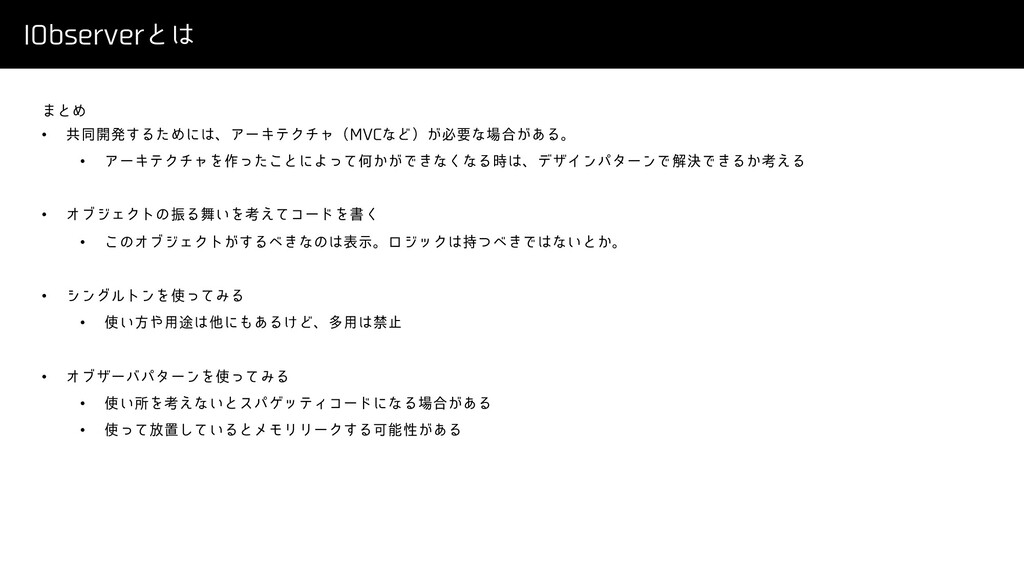 *0CTFSWFSͱ ·ͱΊ • ڞಉ։ൃ͢ΔͨΊʹɺΞʔΩςΫνϟʢ.7$ͳͲʣ͕ඞཁͳ߹͕͋Δɻ • ΞʔΩςΫνϟΛ࡞ͬͨ͜ͱʹΑͬͯԿ͔͕Ͱ͖ͳ͘ͳΔ࣌ɺσβΠϯύλʔϯͰղܾͰ͖Δ͔ߟ͑Δ • ΦϒδΣΫτͷৼΔ͍Λߟ͑ͯίʔυΛॻ͘ • ͜ͷΦϒδΣΫτ͕͢Δ͖ͳͷදࣔɻϩδοΫ͖࣋ͭͰͳ͍ͱ͔ɻ