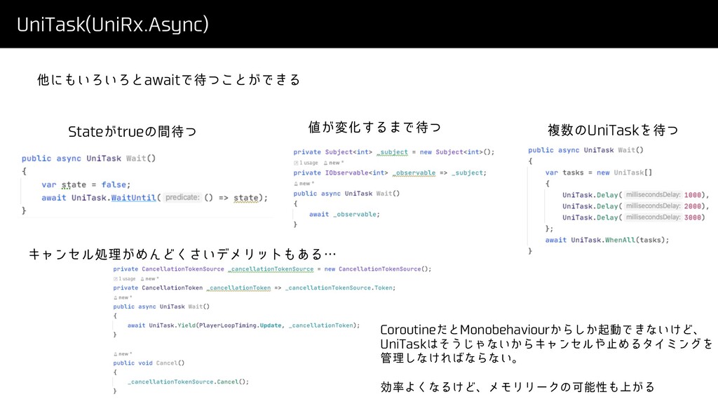 6OJ5BTL 6OJ3Y"TZOD ଞʹ͍Ζ͍ΖͱBXBJUͰͭ͜ͱ͕Ͱ͖Δ 4UBUF͕USVFͷؒͭ ͕มԽ͢Δ·Ͱͭ ෳͷ6OJ5BTLΛͭ Ωϟϯηϧॲཧ͕ΊΜͲ͍͘͞σϝϦοτ͋Δʜ $PSPVUJOFͩͱ.POPCFIBWJPVS͔Β͔͠ىಈͰ͖ͳ͍͚Ͳɺ 6OJ5BTLͦ͏͡Όͳ͍͔ΒΩϟϯηϧࢭΊΔλΠϛϯάΛ ཧ͠ͳ͚ΕͳΒͳ͍ɻ