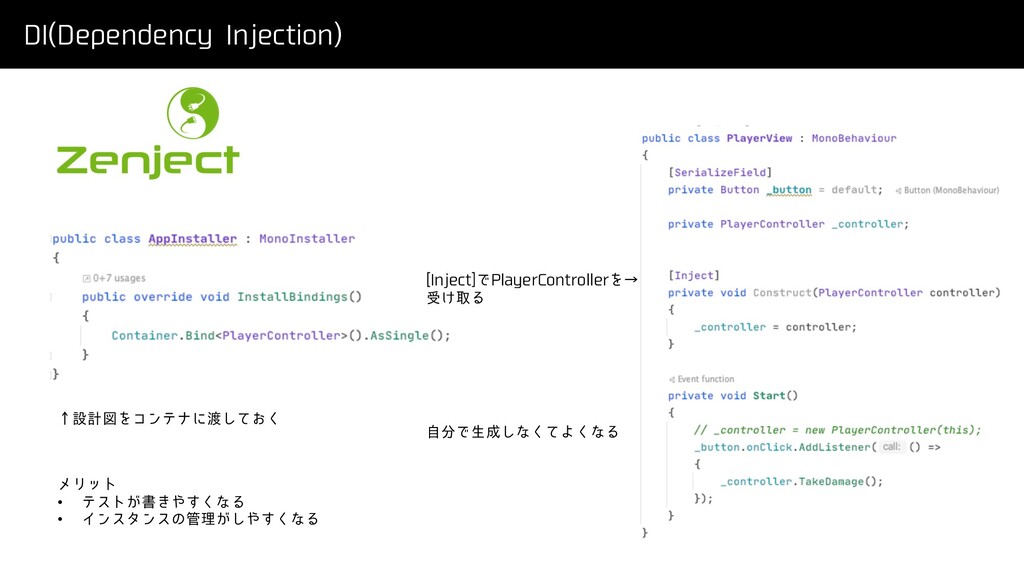 %* %FQFOEFODZ*OKFDUJPO ˢઃܭਤΛίϯςφʹ͓ͯ͘͠ <*OKFDU>Ͱ1MBZFS$POUSPMMFSΛˠ ड͚औΔ ࣗͰੜ͠ͳͯ͘Α͘ͳΔ ϝϦοτ • ςετ͕ॻ͖͘͢ͳΔ •
