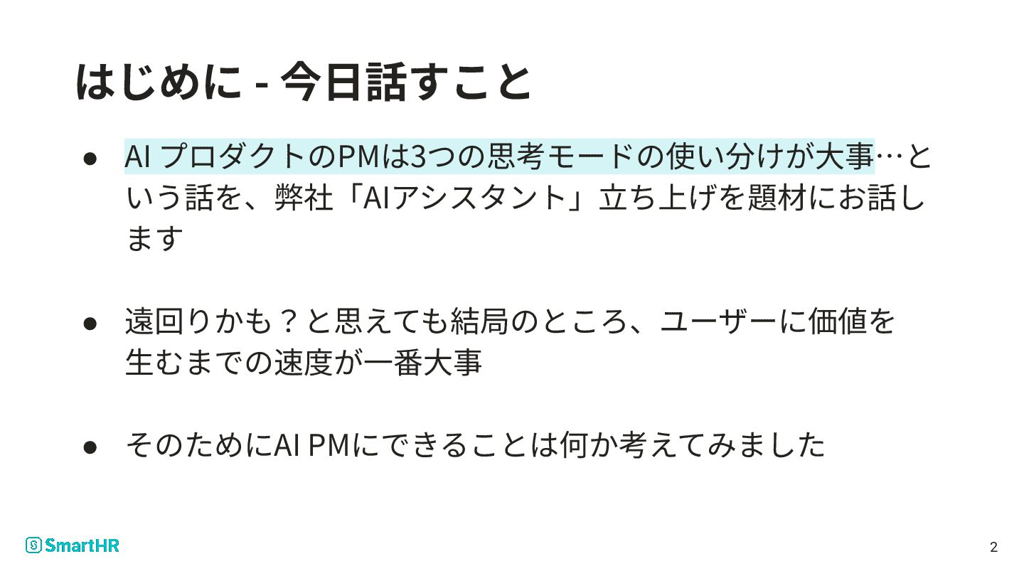 はじめに - 今⽇話すこと 2 • AI プロダクトのPMは3つの思考モードの使い分けが⼤事…と いう話を、弊社「AIアシスタント」⽴ち上げを題材にお話し ます •