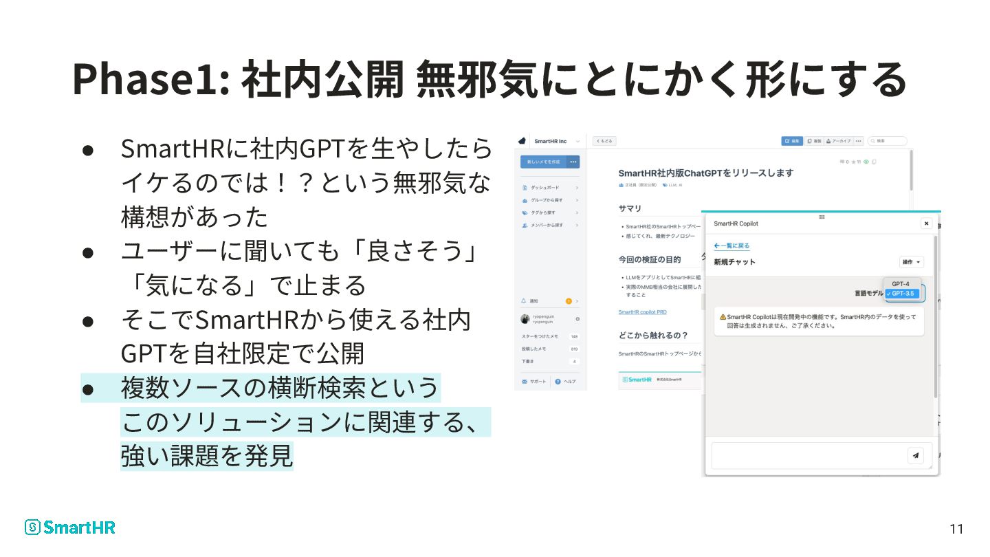 Phase1: 社内公開 無邪気にとにかく形にする 11 • SmartHRに社内GPTを⽣やしたら イケるのでは!?という無邪気な 構想があった • ユーザーに聞いても「良さそう」