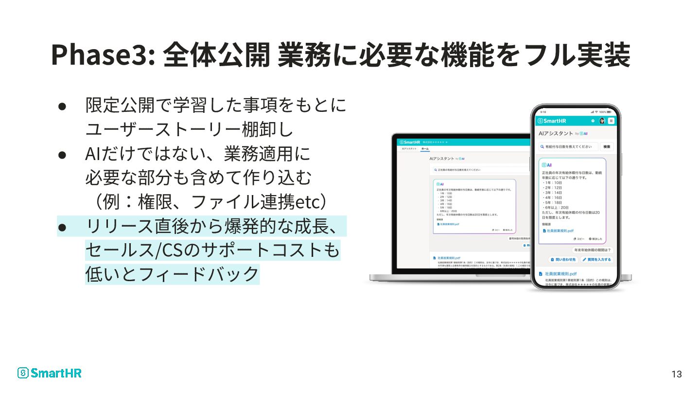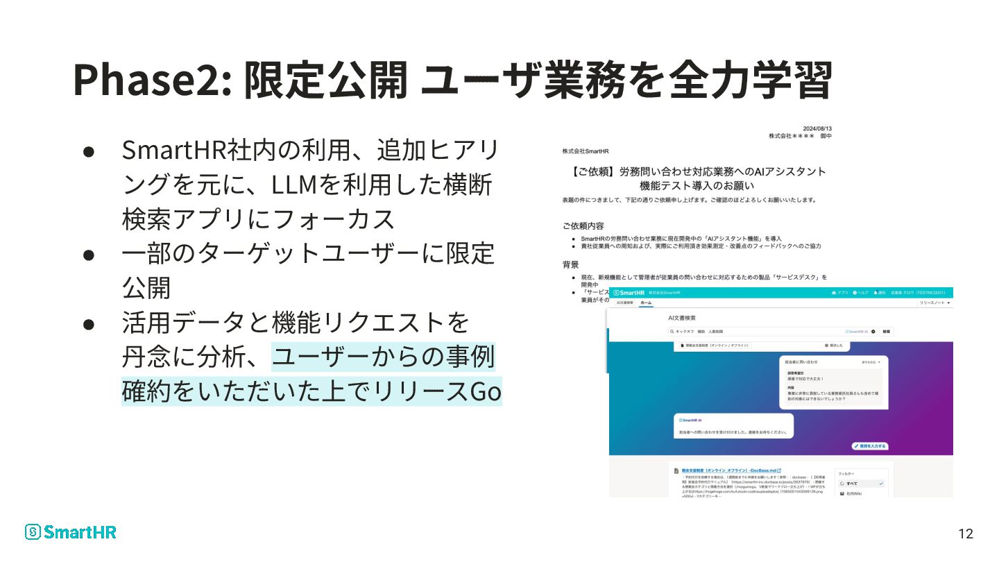 Phase2: 限定公開 ユーザ業務を全⼒学習 12 • SmartHR社内の利⽤、追加ヒアリ ングを元に、LLMを利⽤した横断 検索アプリにフォーカス • ⼀部のターゲットユーザーに限定