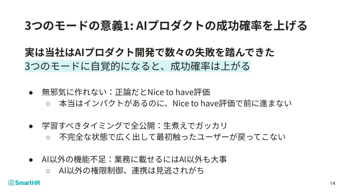 3つのモードの意義1: AIプロダクトの成功確率を上げる 14 実は当社はAIプロダクト開発で数々の失敗を踏んできた 3つのモードに⾃覚的になると、成功確率は上がる • 無邪気に作れない:正論だとNice to have評価 ◦
