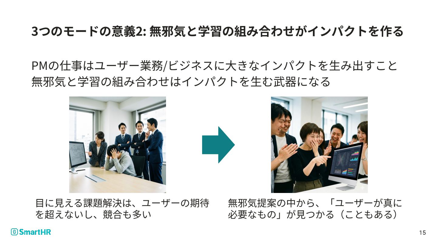 3つのモードの意義2: 無邪気と学習の組み合わせがインパクトを作る 15 PMの仕事はユーザー業務/ビジネスに⼤きなインパクトを⽣み出すこと 無邪気と学習の組み合わせはインパクトを⽣む武器になる ⽬に⾒える課題解決は、ユーザーの期待 を超えないし、競合も多い 無邪気提案の中から、「ユーザーが真に 必要なもの」が⾒つかる(こともある)