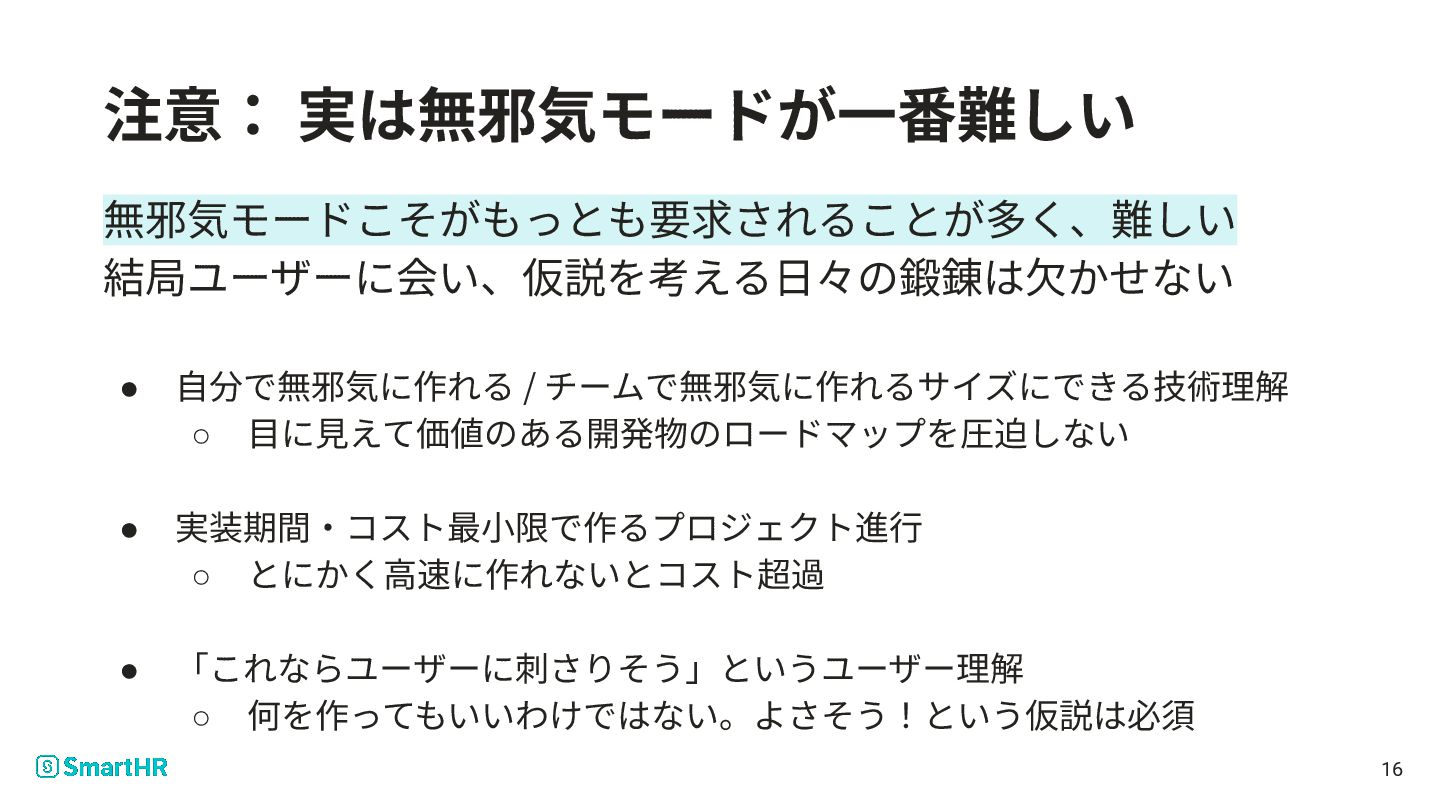 注意: 実は無邪気モードが⼀番難しい 16 無邪気モードこそがもっとも要求されることが多く、難しい 結局ユーザーに会い、仮説を考える⽇々の鍛錬は⽋かせない • ⾃分で無邪気に作れる / チームで無邪気に作れるサイズにできる技術理解 ◦