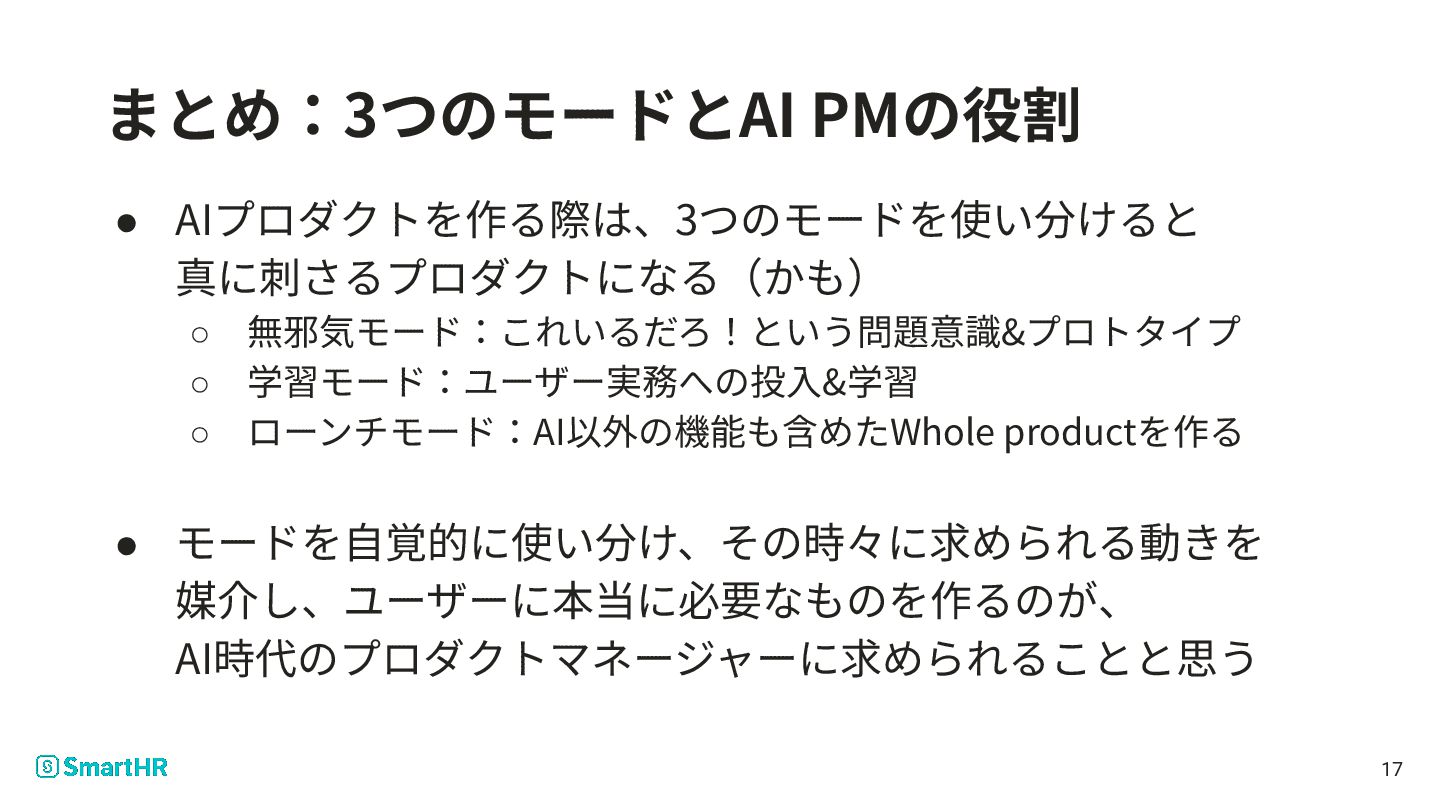 ◦ ローンチモード:AI以外の機能も含めたWhole productを作る • モードを⾃覚的に使い分け、その時々に求められる動きを 媒介し、ユーザーに本当に必要なものを作るのが、 AI時代のプロダクトマネージャーに求められることと思う