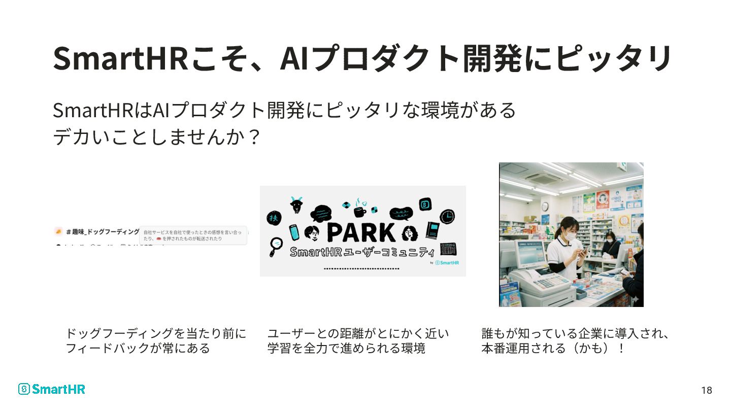 SmartHRこそ、AIプロダクト開発にピッタリ 18 SmartHRはAIプロダクト開発にピッタリな環境がある デカいことしませんか? ドッグフーディングを当たり前に フィードバックが常にある ユーザーとの距離がとにかく近い 学習を全⼒で進められる環境 誰もが知っている企業に導⼊され、 本番運⽤される(かも)!