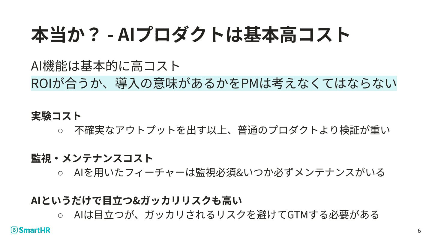本当か? - AIプロダクトは基本⾼コスト 6 AI機能は基本的に⾼コスト ROIが合うか、導⼊の意味があるかをPMは考えなくてはならない 実験コスト ◦ 不確実なアウトプットを出す以上、普通のプロダクトより検証が重い 監視‧メンテナンスコスト