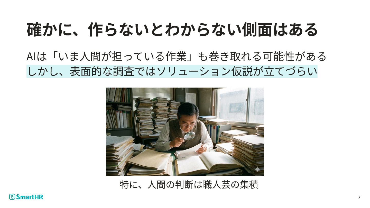 確かに、作らないとわからない側⾯はある 7 AIは「いま⼈間が担っている作業」も巻き取れる可能性がある しかし、表⾯的な調査ではソリューション仮説が⽴てづらい 特に、⼈間の判断は職⼈芸の集積