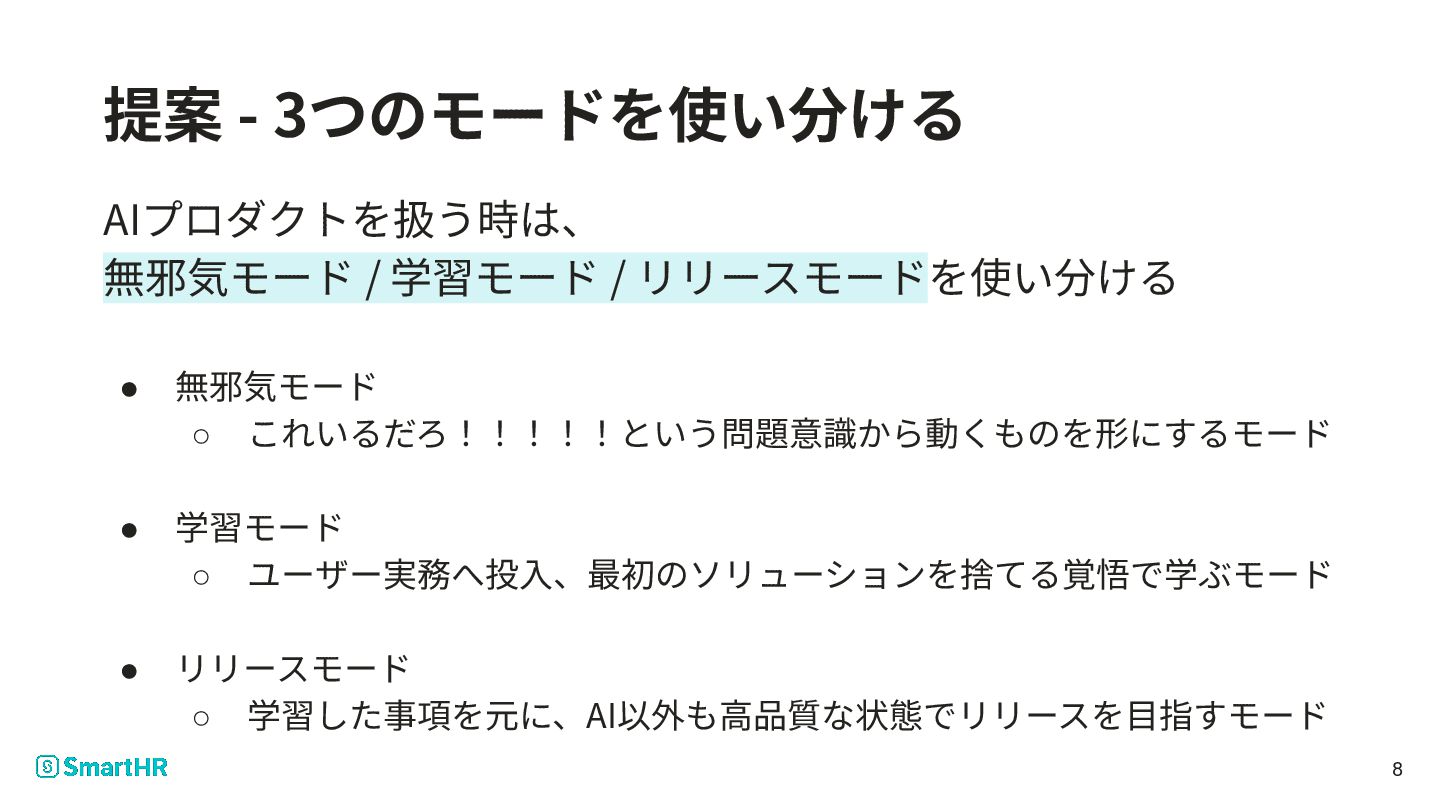 提案 - 3つのモードを使い分ける 8 AIプロダクトを扱う時は、 無邪気モード / 学習モード / リリースモードを使い分ける