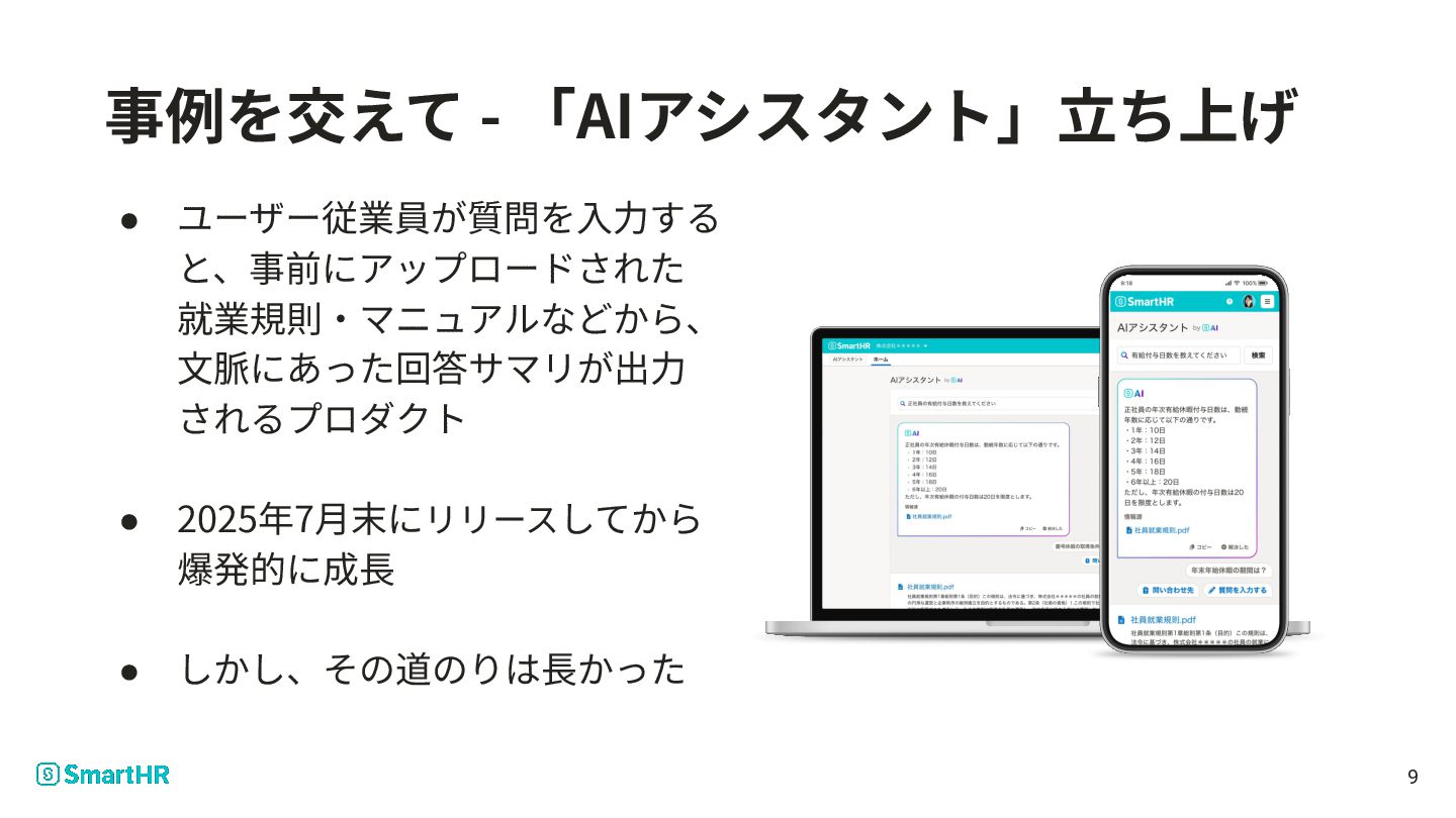 本当はインパクトがあるのに、Nice to have評価で前に進まない • 学習すべきタイミングで全公開:⽣煮えでガッカリ ◦ 不完全な状態で広く出して最初触ったユーザーが戻ってこない • AI以外の機能不⾜:業務に載せるにはAI以外も⼤事 ◦ AI以外の権限制御、連携は⾒逃されがち