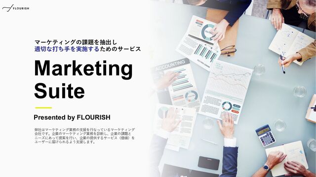 Marketing Suite Presented by FLOURISH マーケティングの課題を抽出し 適切な打ち⼿を実施するためのサービス 弊社はマーケティング業務の⽀援を⾏なっているマーケティング 会社です。企業のマーケティング業務を診断し、企業の課題と ニーズにあって提案を⾏い、企業の提供するサービス(価値)を