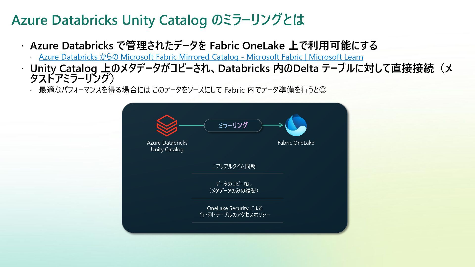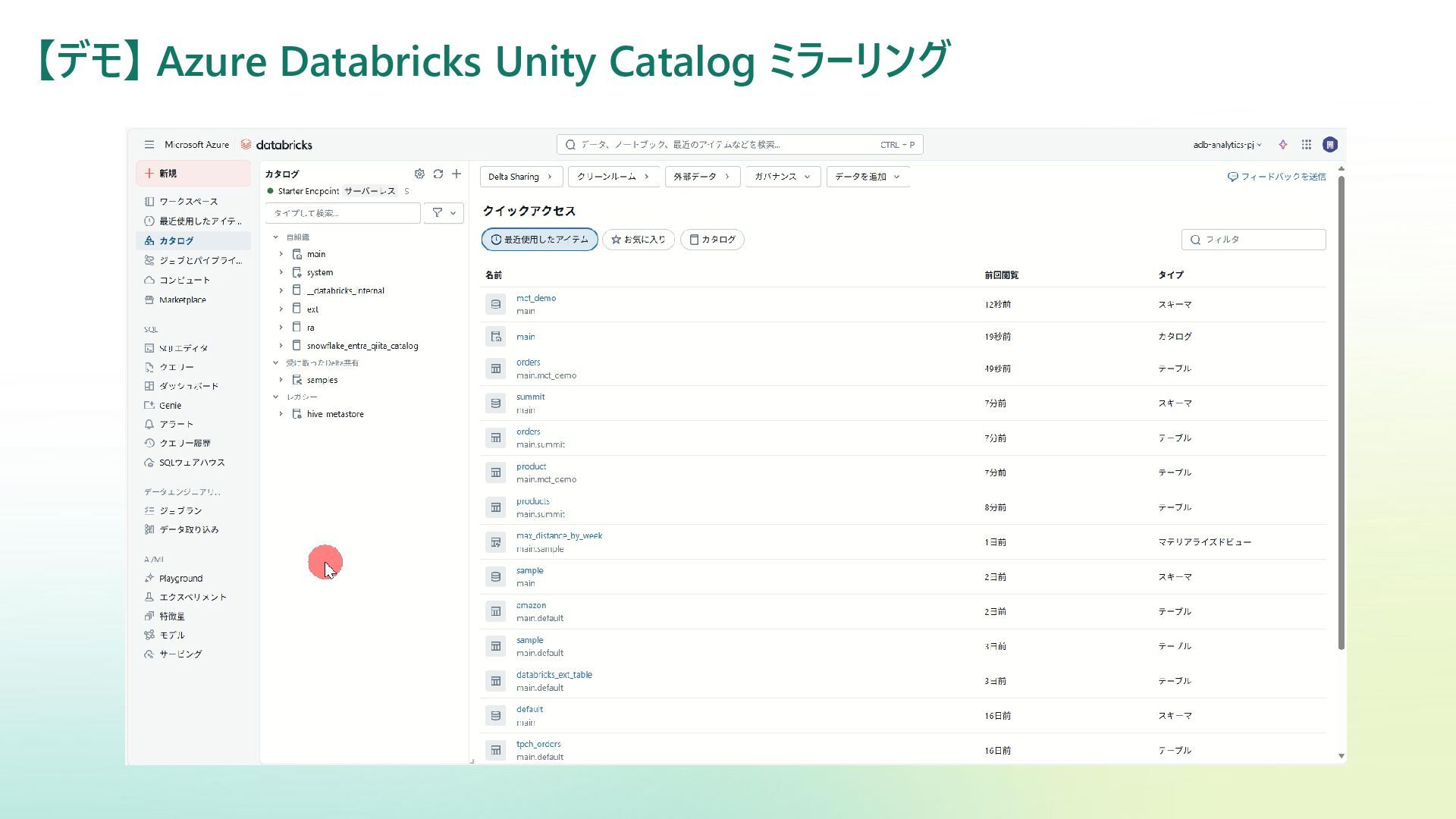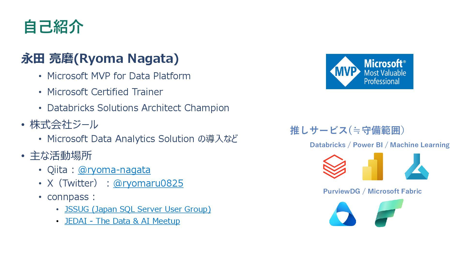 • Microsoft Certified Trainer • Databricks Solutions Architect Champion • 株式会社ジール • Microsoft Data Analytics Solution の導入など • 主な活動場所 • Qiita : @ryoma-nagata • X(Twitter) : @ryomaru0825 • connpass : • JSSUG (Japan SQL Server User Group) • JEDAI - The Data & AI Meetup 推しサービス(≒守備範囲) Databricks / Power BI / Machine Learning PurviewDG / Microsoft Fabric