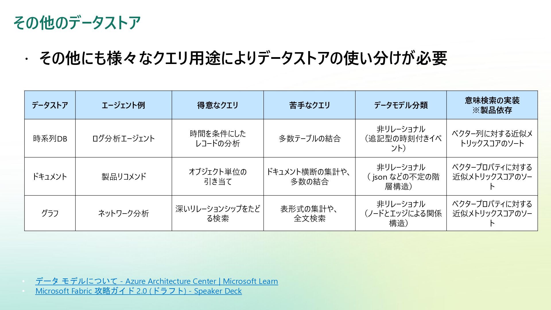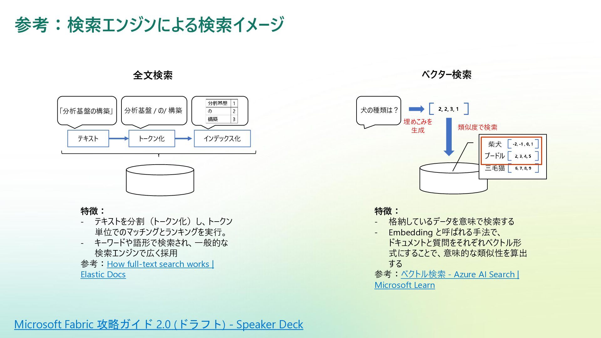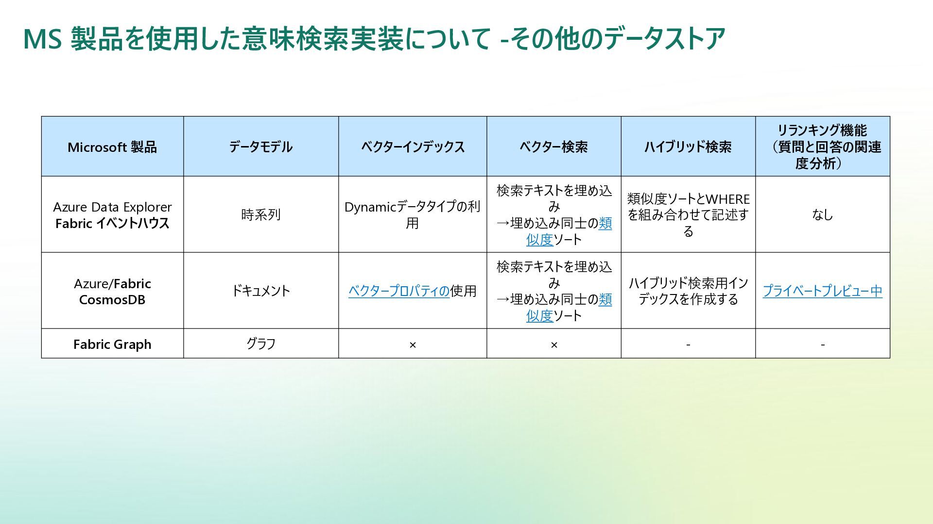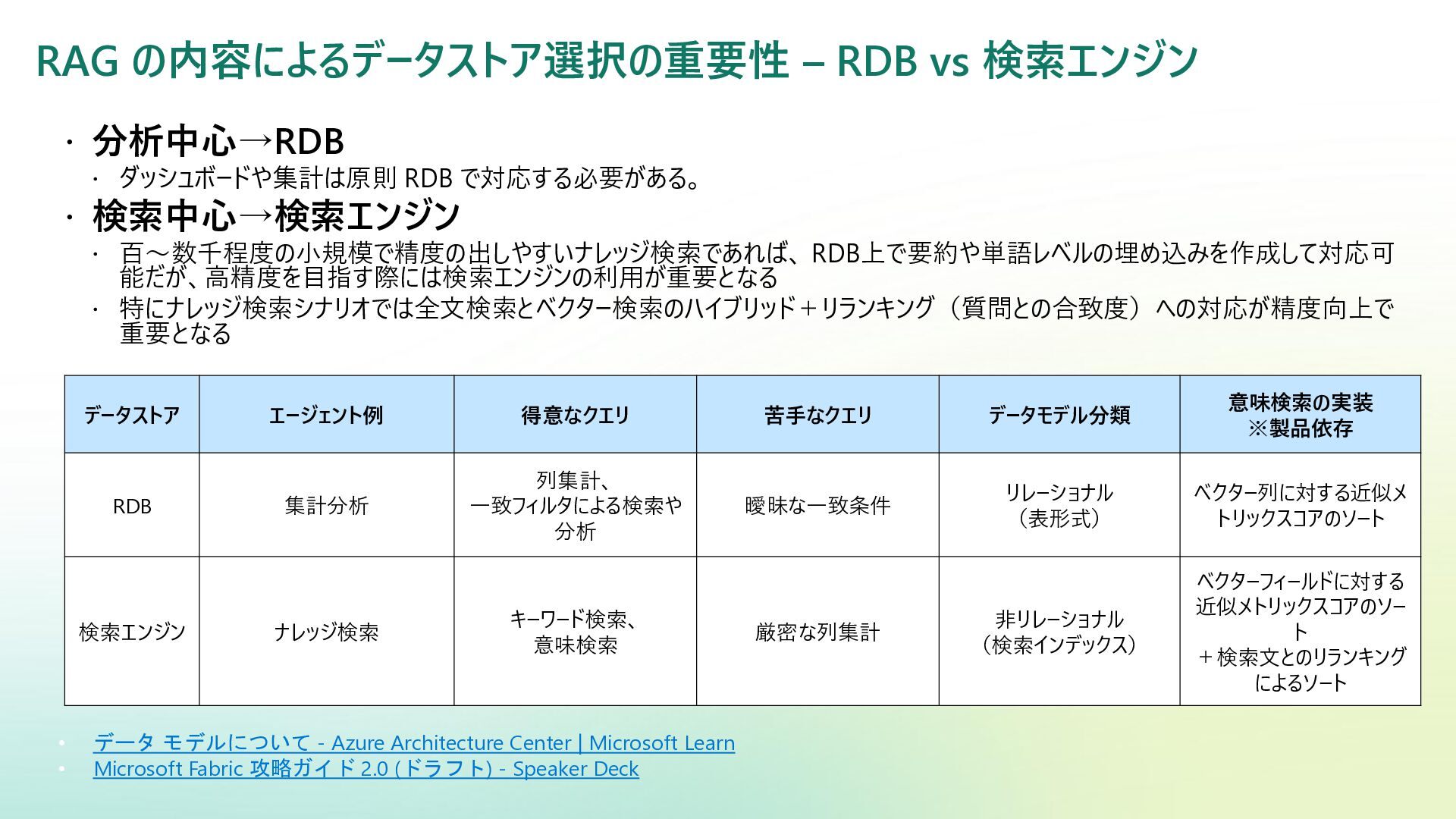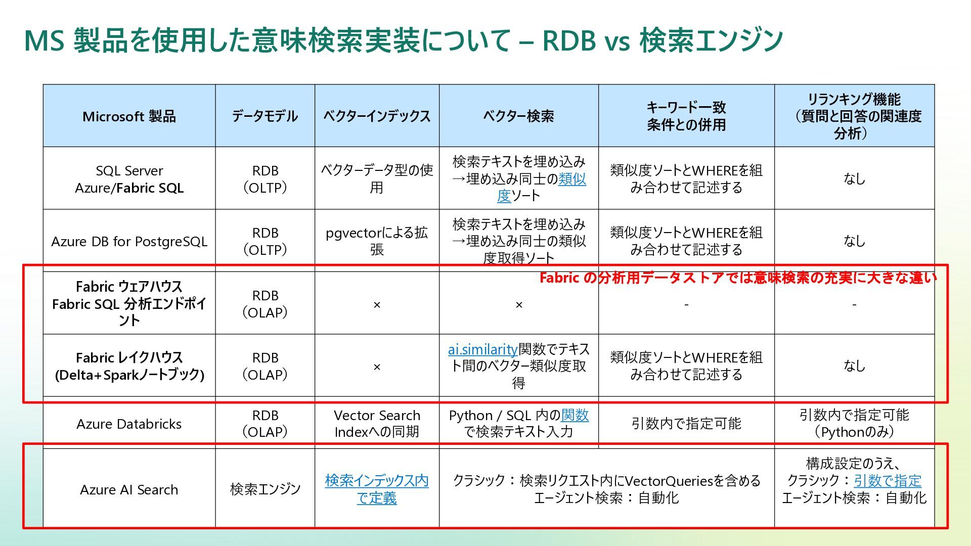 ベクター検索 キーワード一致 条件との併用 リランキング機能 (質問と回答の関連度 分析) SQL Server Azure/Fabric SQL RDB (OLTP) ベクターデータ型の使 用 検索テキストを埋め込み →埋め込み同士の類似 度ソート 類似度ソートとWHEREを組 み合わせて記述する なし Azure DB for PostgreSQL RDB (OLTP) pgvectorによる拡 張 検索テキストを埋め込み →埋め込み同士の類似 度取得ソート 類似度ソートとWHEREを組 み合わせて記述する なし Fabric ウェアハウス Fabric SQL 分析エンドポイ ント RDB (OLAP) × × - - Fabric レイクハウス (Delta+Sparkノートブック) RDB (OLAP) × ai.similarity関数でテキス ト間のベクター類似度取 得 類似度ソートとWHEREを組 み合わせて記述する なし Azure Databricks RDB (OLAP) Vector Search Indexへの同期 Python / SQL 内の関数 で検索テキスト入力 引数内で指定可能 引数内で指定可能 (Pythonのみ) Azure AI Search 検索エンジン 検索インデックス内 で定義 クラシック:検索リクエスト内にVectorQueriesを含める エージェント検索:自動化 構成設定のうえ、 クラシック:引数で指定 エージェント検索:自動化 Fabric の分析用データストアでは意味検索の充実に大きな違い