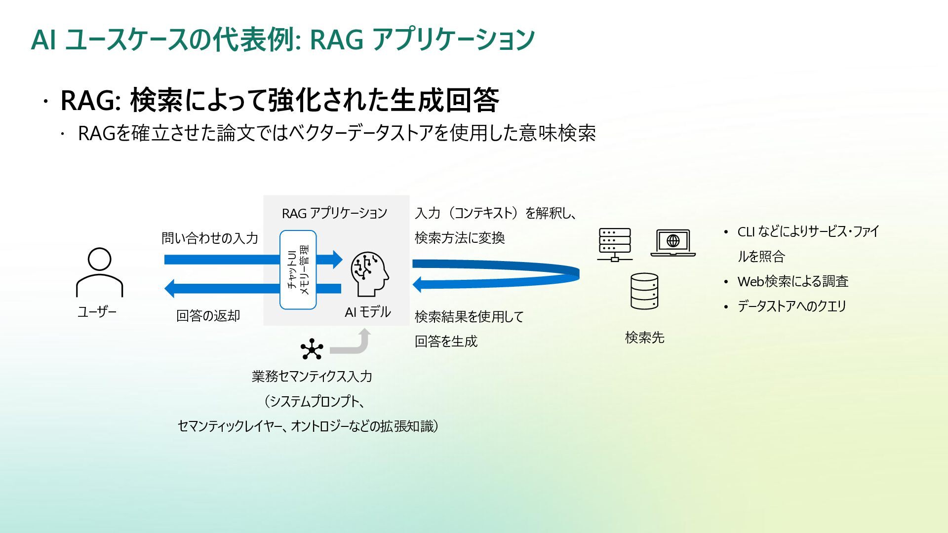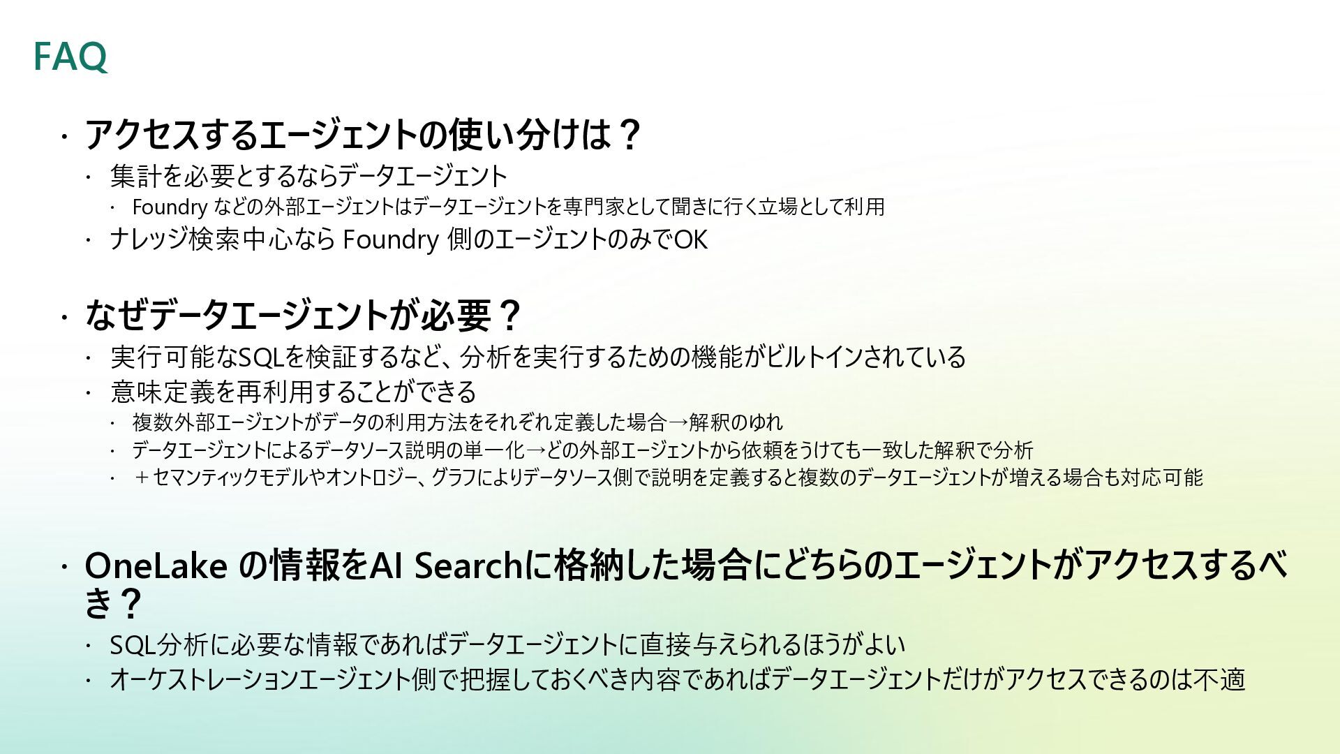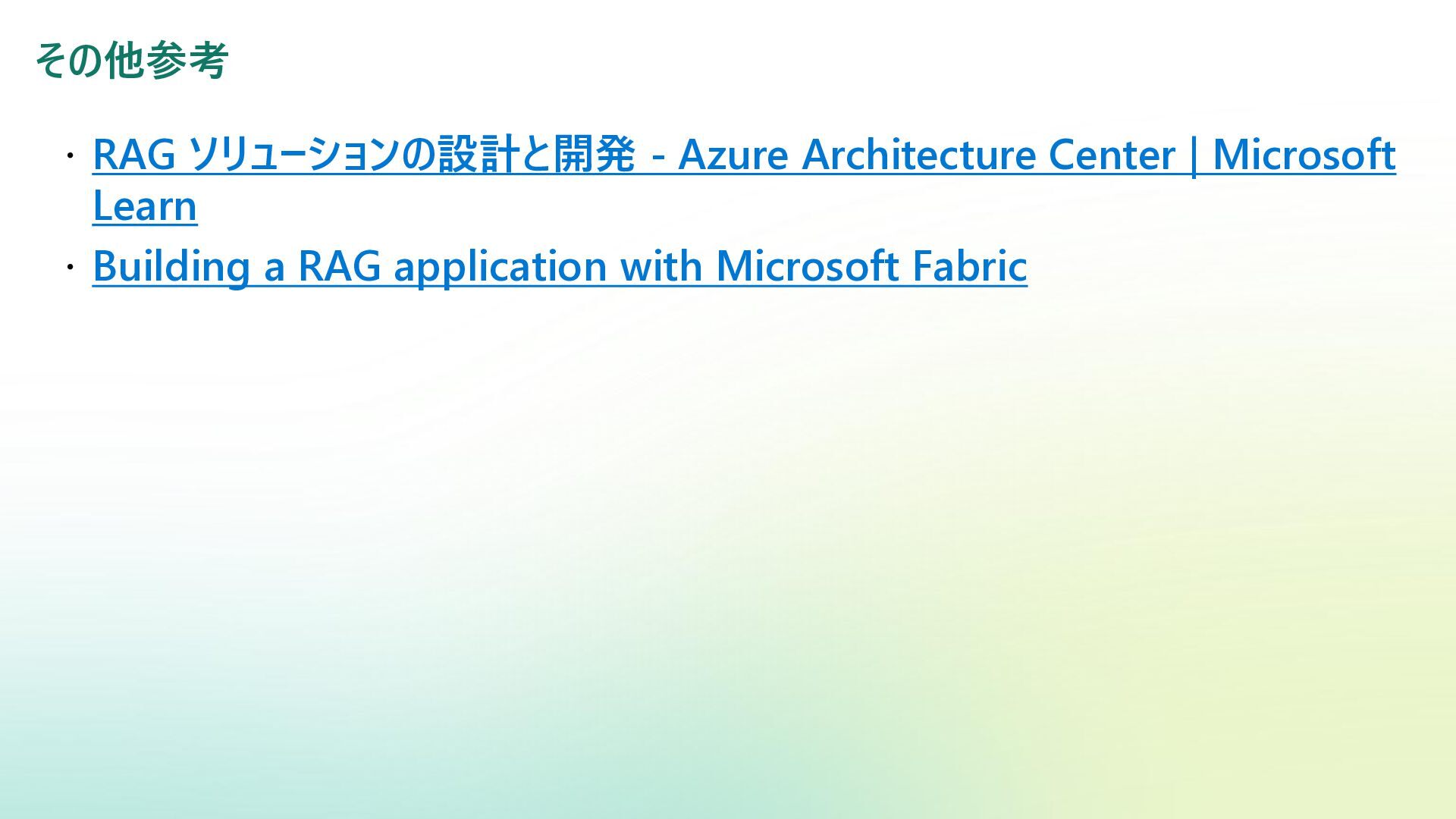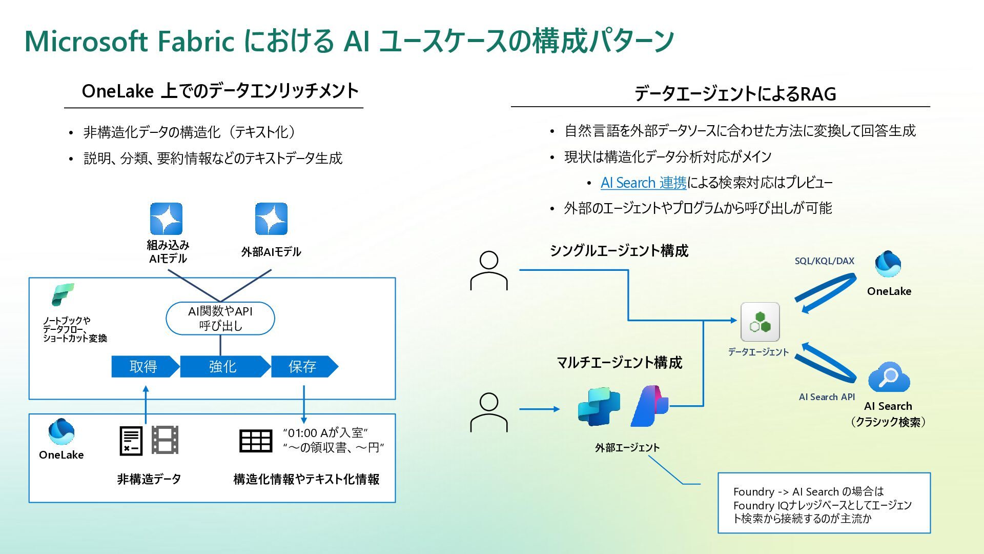 ベクター検索 キーワード一致 条件との併用 リランキング機能 (質問と回答の関連度 分析) SQL Server Azure/Fabric SQL RDB (OLTP) ベクターデータ型の使 用 検索テキストを埋め込み →埋め込み同士の類似 度ソート 類似度ソートとWHEREを組 み合わせて記述する なし Azure DB for PostgreSQL RDB (OLTP) pgvectorによる拡 張 検索テキストを埋め込み →埋め込み同士の類似 度取得ソート 類似度ソートとWHEREを組 み合わせて記述する なし Fabric ウェアハウス Fabric SQL 分析エンドポイ ント RDB (OLAP) × × - - Fabric レイクハウス (Delta+Sparkノートブック) RDB (OLAP) × ai.similarity関数でテキス ト間のベクター類似度取 得 類似度ソートとWHEREを組 み合わせて記述する なし Azure Databricks RDB (OLAP) Vector Search Indexへの同期 Python / SQL 内の関数 で検索テキスト入力 引数内で指定可能 引数内で指定可能 (Pythonのみ) Azure AI Search 検索エンジン 検索インデックス内 で定義 クラシック:検索リクエスト内にVectorQueriesを含める エージェント検索:自動化 構成設定のうえ、 クラシック:引数で指定 エージェント検索:自動化 Fabric の分析用データストアでは意味検索の充実に大きな違い