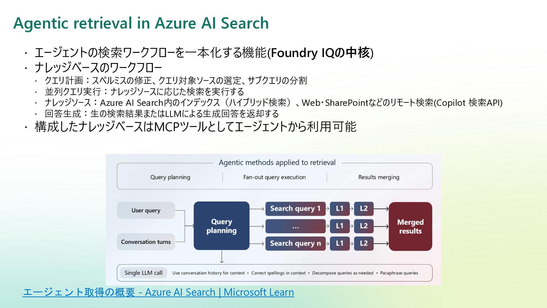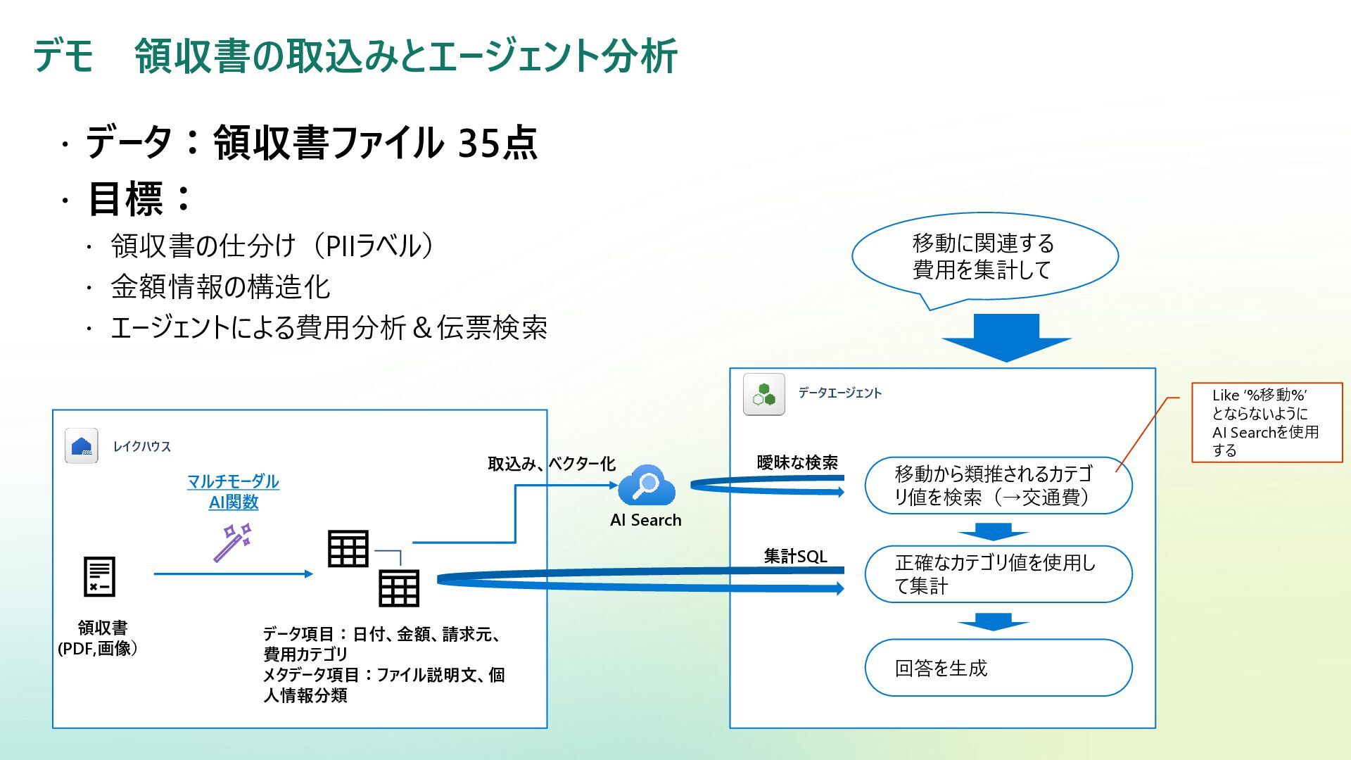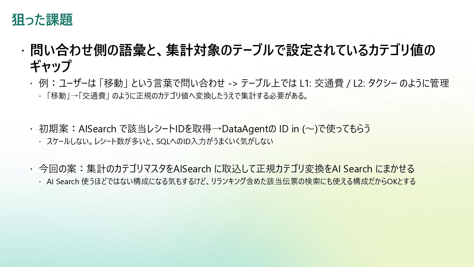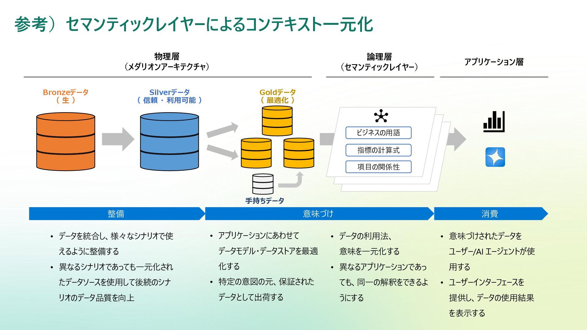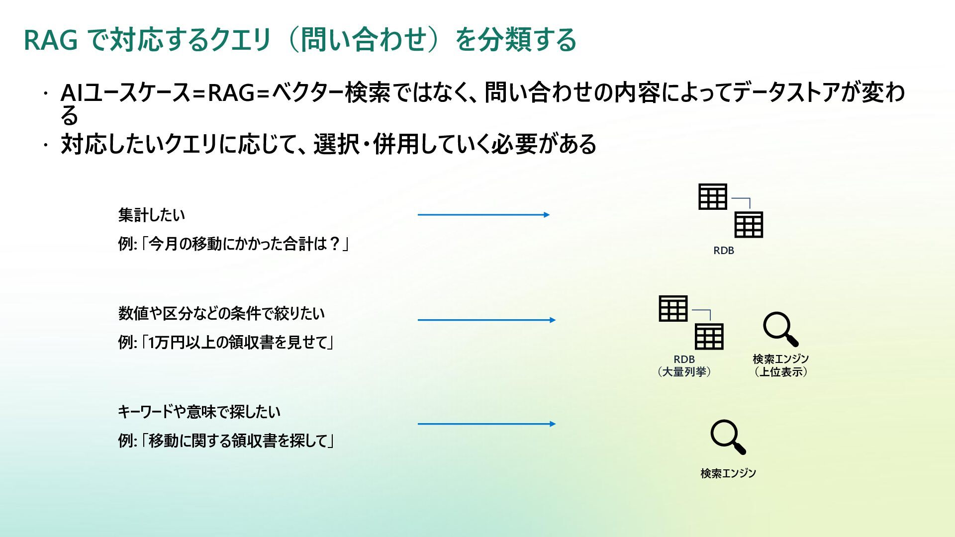 ベクター検索 キーワード一致 条件との併用 リランキング機能 (質問と回答の関連度 分析) SQL Server Azure/Fabric SQL RDB (OLTP) ベクターデータ型の使 用 検索テキストを埋め込み →埋め込み同士の類似 度ソート 類似度ソートとWHEREを組 み合わせて記述する なし Azure DB for PostgreSQL RDB (OLTP) pgvectorによる拡 張 検索テキストを埋め込み →埋め込み同士の類似 度取得ソート 類似度ソートとWHEREを組 み合わせて記述する なし Fabric ウェアハウス Fabric SQL 分析エンドポイ ント RDB (OLAP) × × - - Fabric レイクハウス (Delta+Sparkノートブック) RDB (OLAP) × ai.similarity関数でテキス ト間のベクター類似度取 得 類似度ソートとWHEREを組 み合わせて記述する なし Azure Databricks RDB (OLAP) Vector Search Indexへの同期 Python / SQL 内の関数 で検索テキスト入力 引数内で指定可能 引数内で指定可能 (Pythonのみ) Azure AI Search 検索エンジン 検索インデックス内 で定義 クラシック:検索リクエスト内にVectorQueriesを含める エージェント検索:自動化 構成設定のうえ、 クラシック:引数で指定 エージェント検索:自動化 Fabric の分析用データストアでは意味検索の充実に大きな違い