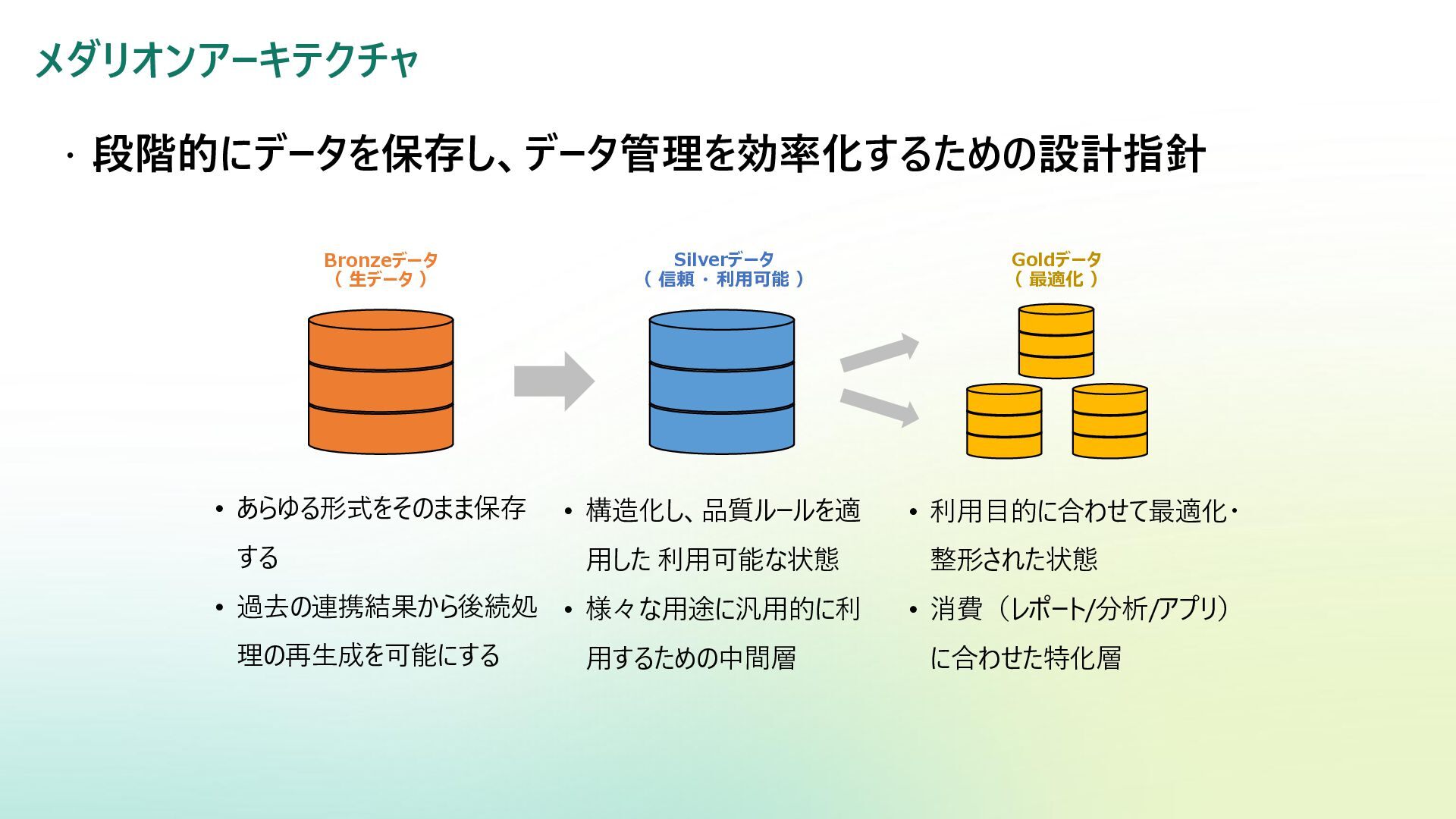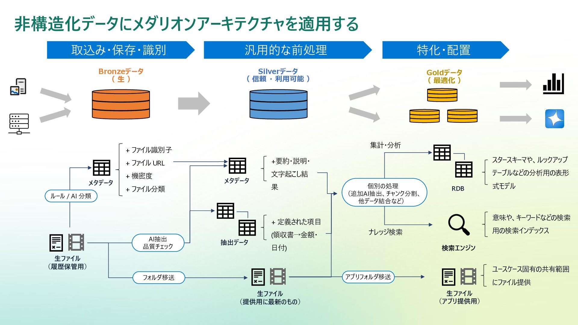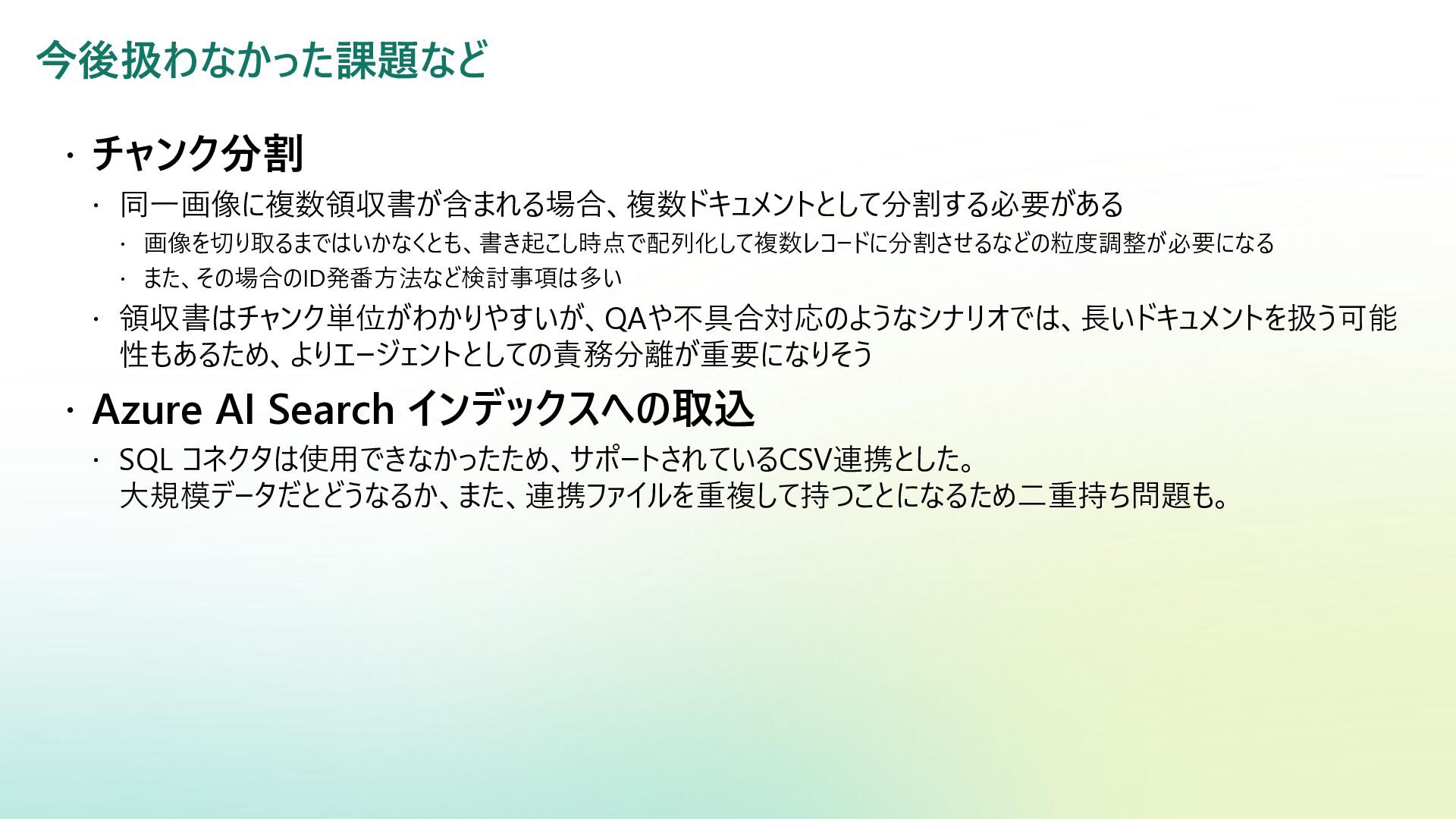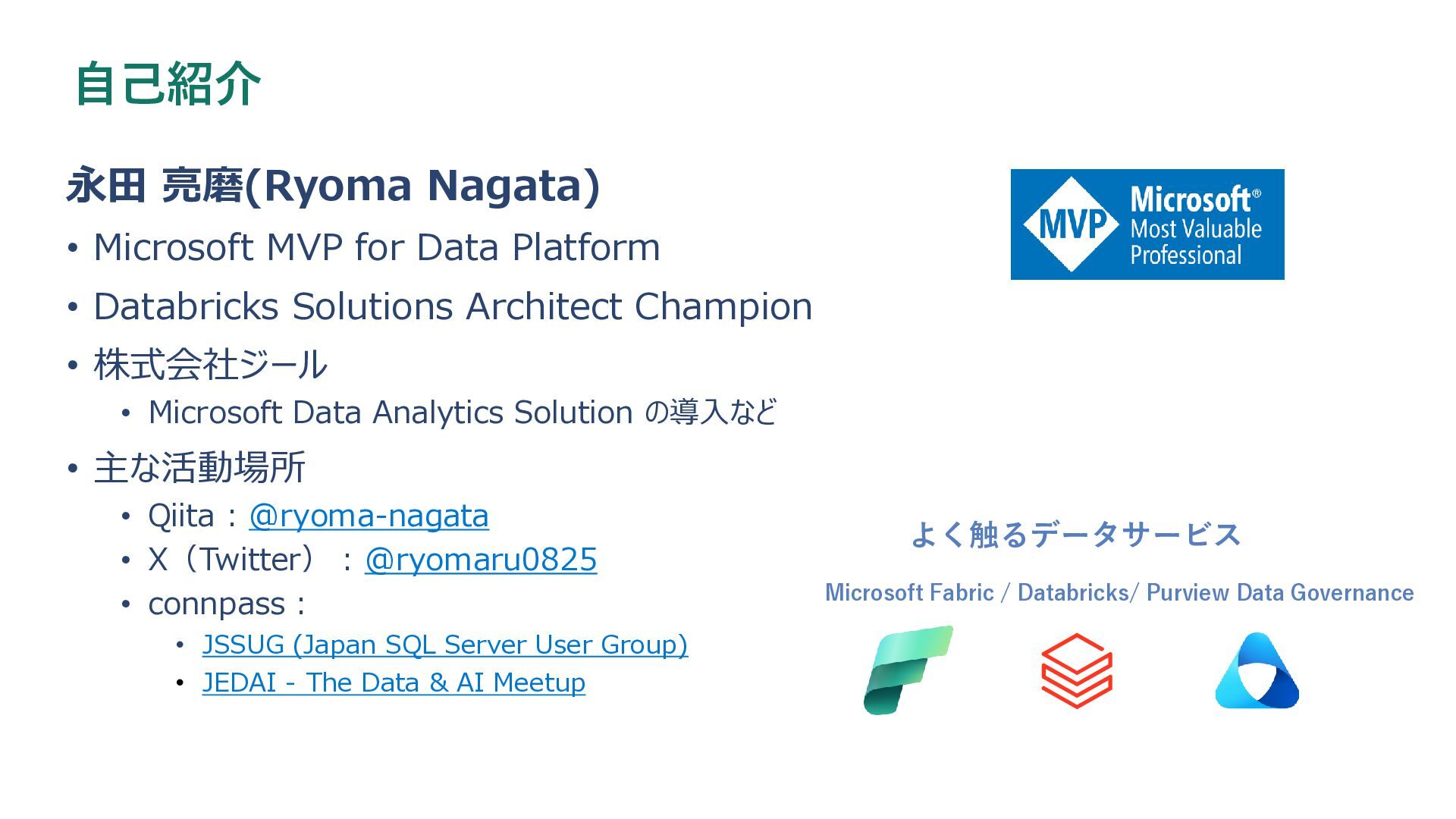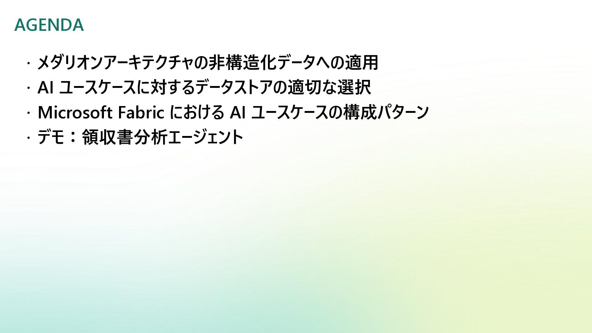 ベクター検索 キーワード一致 条件との併用 リランキング機能 (質問と回答の関連度 分析) SQL Server Azure/Fabric SQL RDB (OLTP) ベクターデータ型の使 用 検索テキストを埋め込み →埋め込み同士の類似 度ソート 類似度ソートとWHEREを組 み合わせて記述する なし Azure DB for PostgreSQL RDB (OLTP) pgvectorによる拡 張 検索テキストを埋め込み →埋め込み同士の類似 度取得ソート 類似度ソートとWHEREを組 み合わせて記述する なし Fabric ウェアハウス Fabric SQL 分析エンドポイ ント RDB (OLAP) × × - - Fabric レイクハウス (Delta+Sparkノートブック) RDB (OLAP) × ai.similarity関数でテキス ト間のベクター類似度取 得 類似度ソートとWHEREを組 み合わせて記述する なし Azure Databricks RDB (OLAP) Vector Search Indexへの同期 Python / SQL 内の関数 で検索テキスト入力 引数内で指定可能 引数内で指定可能 (Pythonのみ) Azure AI Search 検索エンジン 検索インデックス内 で定義 クラシック:検索リクエスト内にVectorQueriesを含める エージェント検索:自動化 構成設定のうえ、 クラシック:引数で指定 エージェント検索:自動化 Fabric の分析用データストアでは意味検索の充実に大きな違い