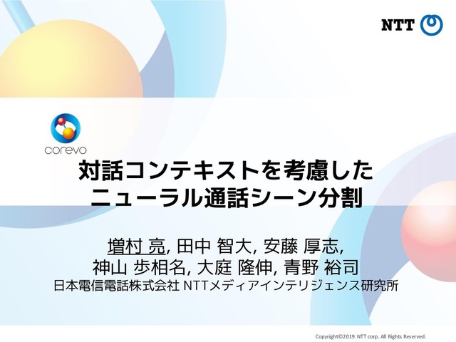 (1:) = { 1 , … , } 発話文は単語系列: = { 1 (), … , () () } 発話単位の通話シーンラベル系列: (1:) = { 1 , … , } 通話シーンラベル: = {opening, requirement confirimation, response, customer confirmation, closing} 発話単位の話者役割ラベル系列: (1:) = { 1 , … , } 話者役割ラベル: = {oeperator, customer} モデルの出力 ニューラル通話シーン分割のモデル化 オンライン処理向けのモデル化: ( | 1: , 1: , ) バッチ処理向けのモデル化: ((1:)| 1: , 1: , ) モデルの入力