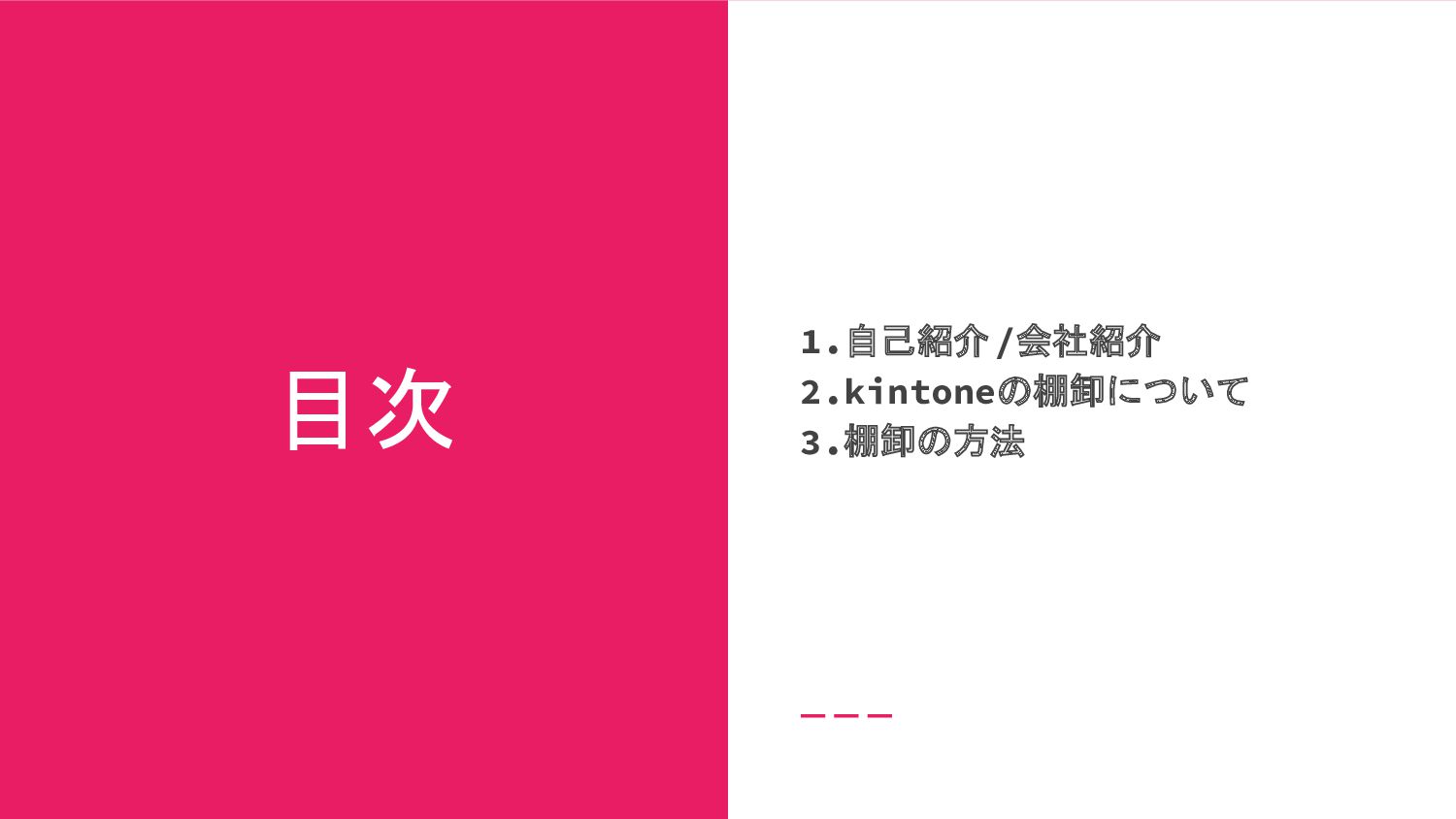 目次 1.自己紹介/会社紹介 2.kintoneの棚卸について 3.棚卸の方法