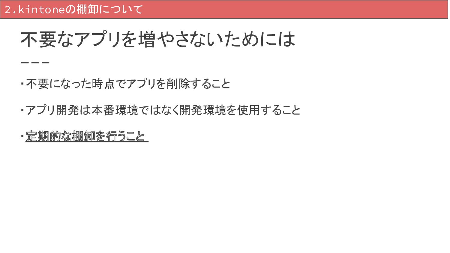 不要なアプリを増やさないためには ・不要になった時点でアプリを削除すること ・アプリ開発は本番環境ではなく開発環境を使用すること ・定期的な棚卸を行うこと 2.kintoneの棚卸について