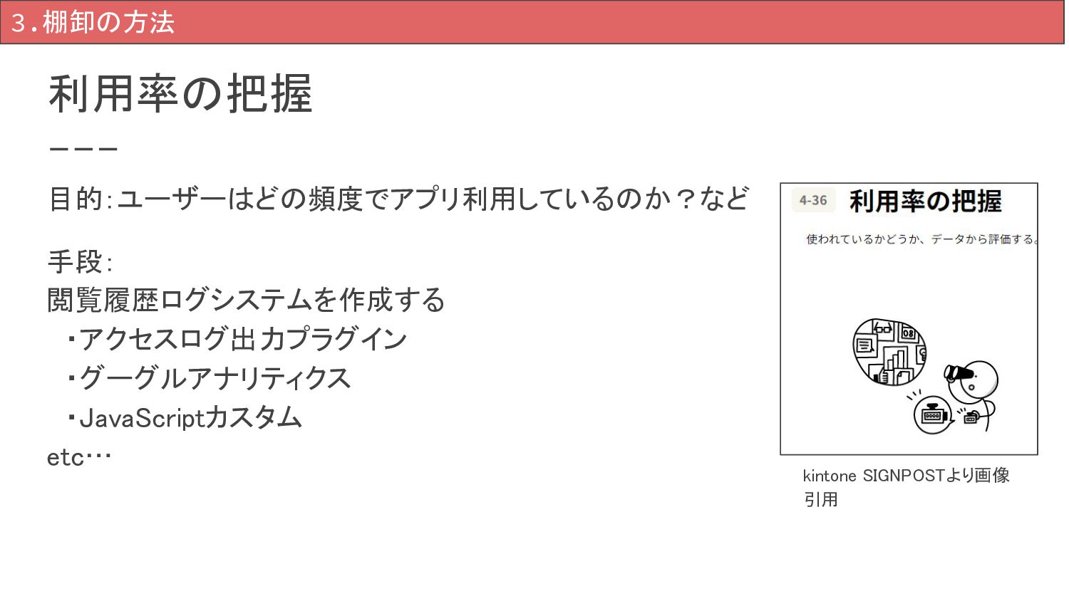 利用率の把握 3.棚卸の方法 目的:ユーザーはどの頻度でアプリ利用しているのか?など 手段: 閲覧履歴ログシステムを作成する ・アクセスログ出力プラグイン ・グーグルアナリティクス ・JavaScriptカスタム etc… kintone