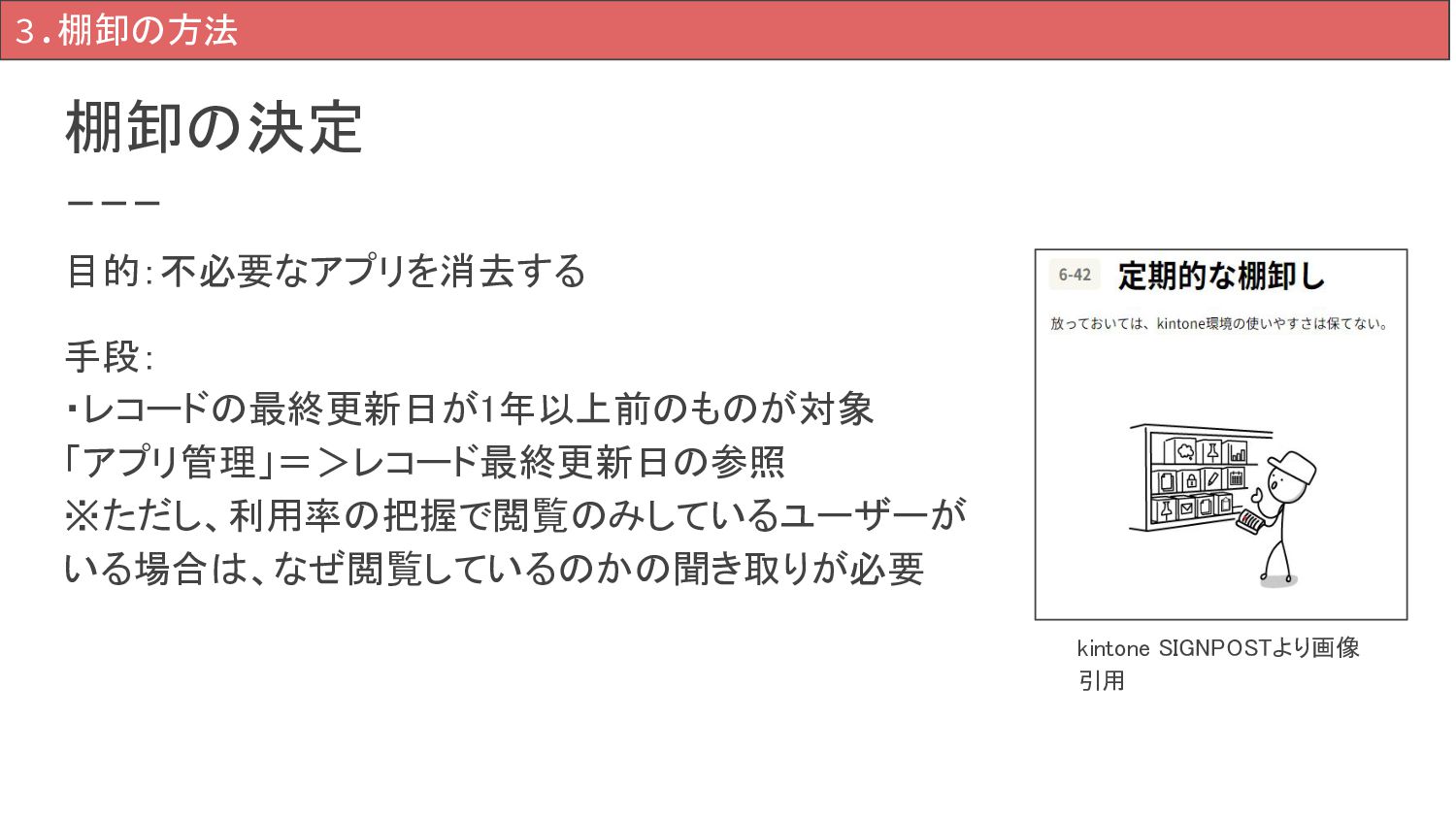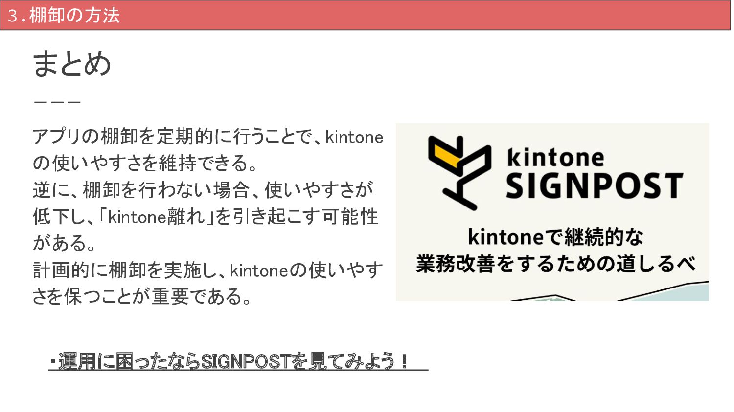 まとめ 3.棚卸の方法 アプリの棚卸を定期的に行うことで、kintone の使いやすさを維持できる。 逆に、棚卸を行わない場合、使いやすさが 低下し、「kintone離れ」を引き起こす可能性 がある。 計画的に棚卸を実施し、kintoneの使いやす さを保つことが重要である。 ・運用に困ったならSIGNPOSTを見てみよう!