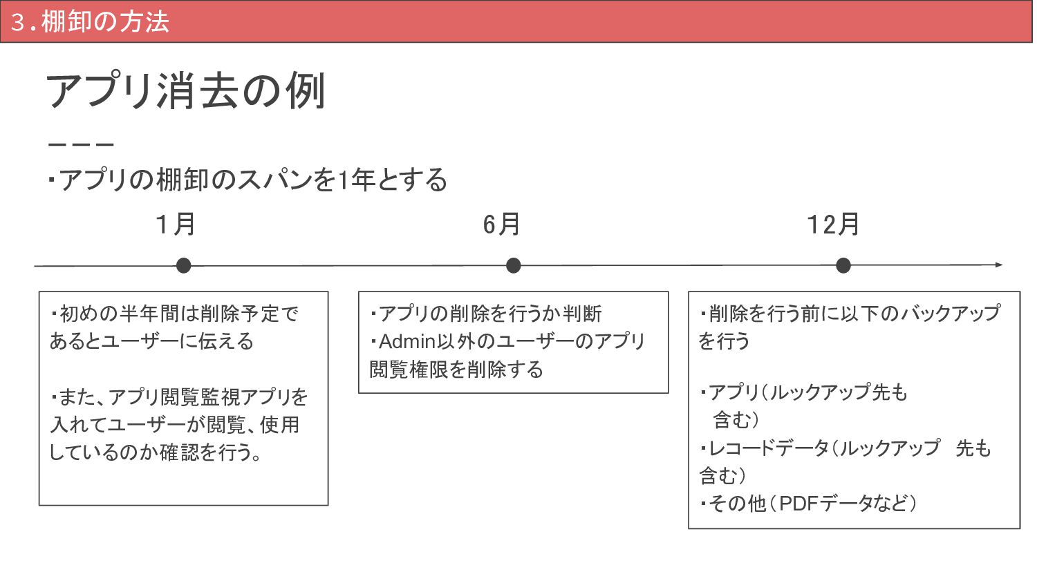 ・アプリの削除を行うか判断 ・Admin以外のユーザーのアプリ 閲覧権限を削除する 1月 6月 12月 ・削除を行う前に以下のバックアップ を行う ・アプリ(ルックアップ先も 含む) ・レコードデータ(ルックアップ 先も 含む) ・その他(PDFデータなど)