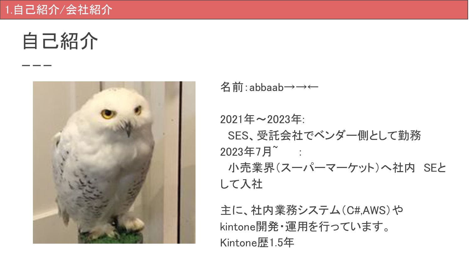 自己紹介 名前:abbaab→→← 2021年~2023年: SES、受託会社でベンダー側として勤務 2023年7月~ : 小売業界(スーパーマーケット)へ社内 SEと して入社 主に、社内業務システム(C#,AWS)や