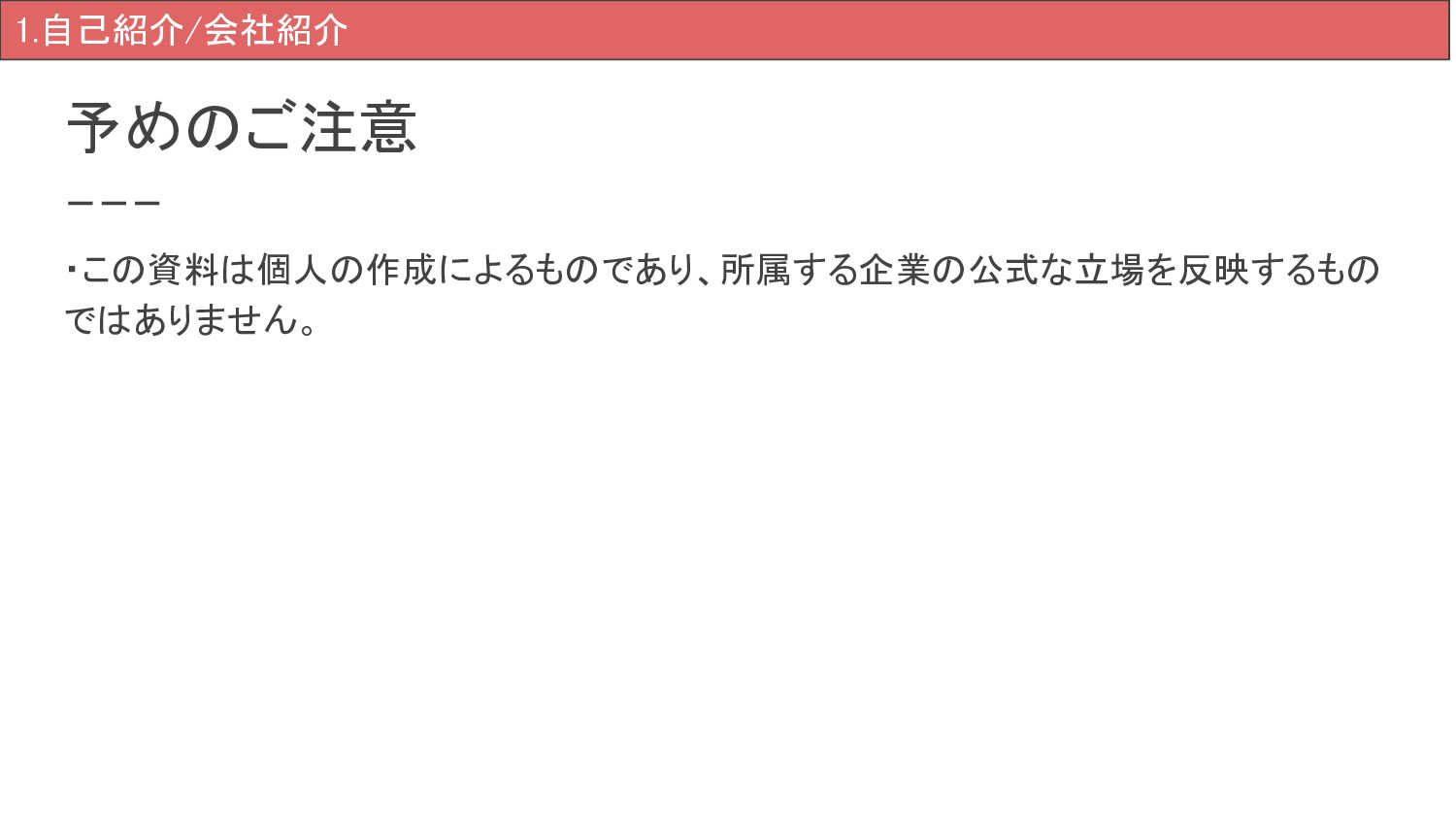 予めのご注意 ・この資料は個人の作成によるものであり、所属する企業の公式な立場を反映するもの ではありません。 1.自己紹介/会社紹介