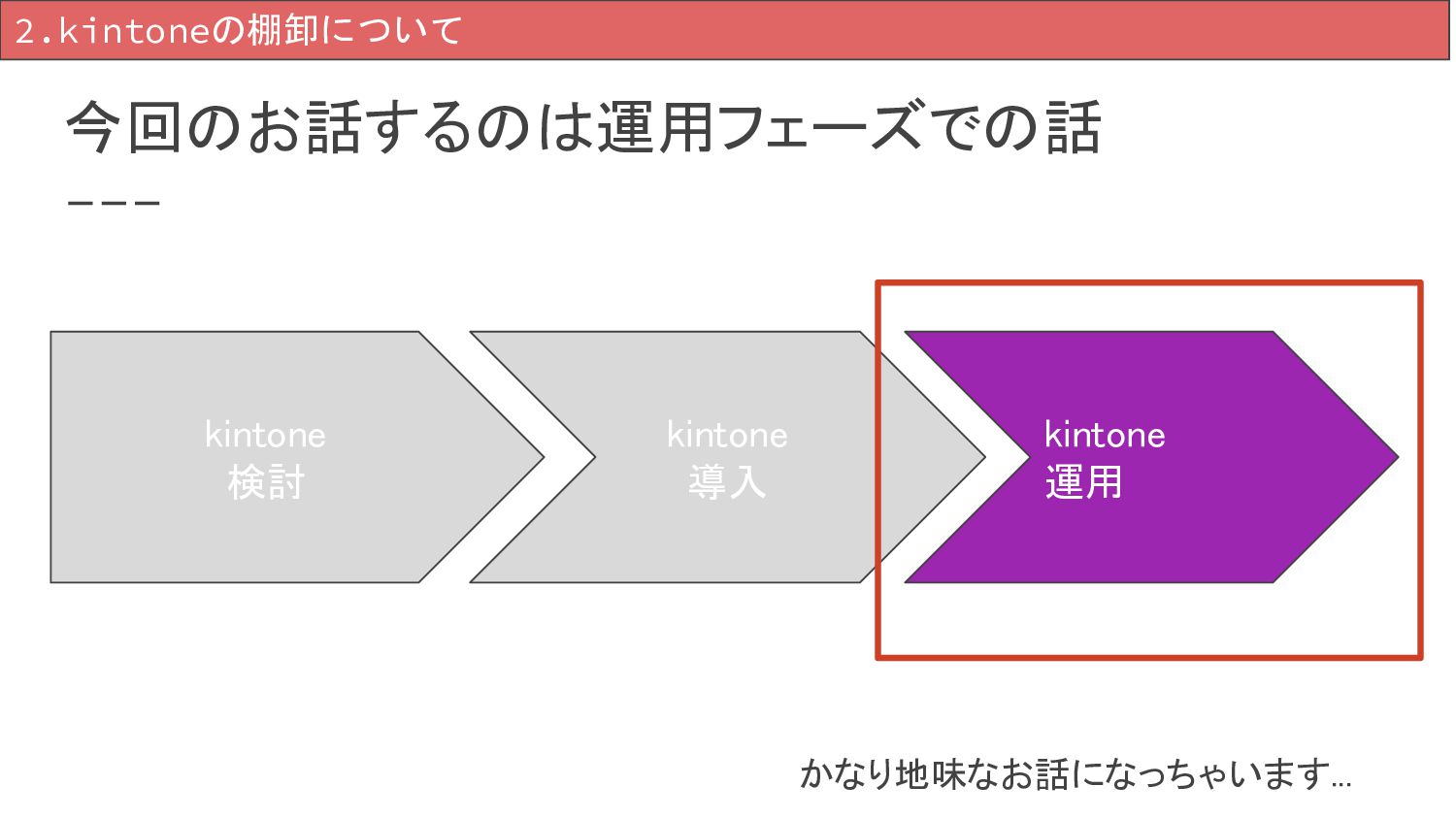 今回のお話するのは運用フェーズでの話 2.kintoneの棚卸について kintone 検討 kintone 導入 kintone 運用 かなり地味なお話になっちゃいます...
